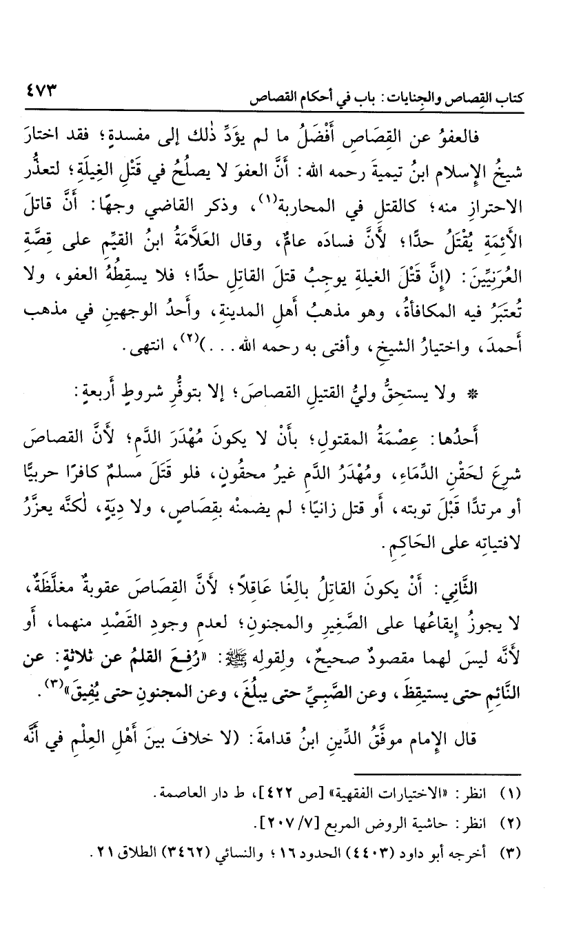 الثاني: أن يكون القاتل بالغا عاقلاً؛ لأن القصاص عقوبة مغلطة، لا يجوز إيقاعها على الصغير والمجنون؛ لعدم وجود القصد منهما، أو لأنه ليس لهما مقصود صحيح، ولقوله صلى الله عليه وسلم: "رفع القلم عن ثلاثة: عن النائم حتى يستيقظ، وعن الصبي حتى يبلغ، وعن المجنون حتى يفيق".