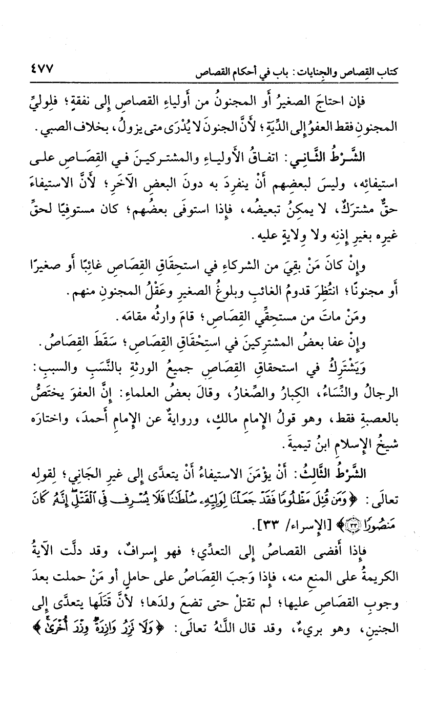 الشرط الثالث: أن يؤمن الاستيفاء أن يتعدى إلى غير الجاني؛ لقوله تعالى: {وَمَنْ قُتِلَ مَظْلُوماً فَقَدْ جَعَلْنَا لِوَلِيِّهِ سُلْطَاناً فَلا يُسْرِفْ فِي الْقَتْلِ إِنَّهُ كَانَ مَنْصُوراً} .