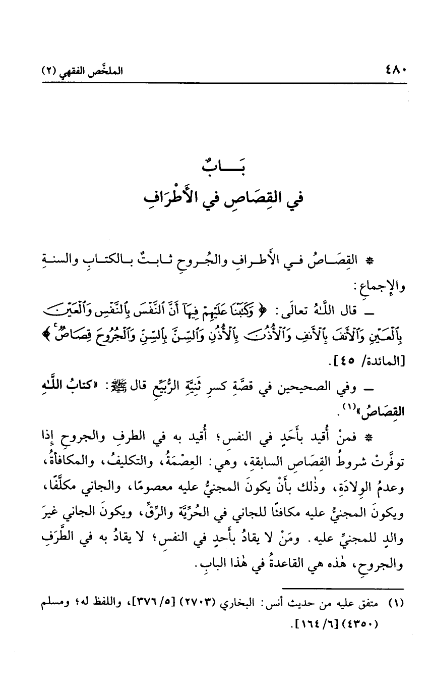 القصاص في الأطراف والجروح ثابت بالكتاب والسنة والإجماع: