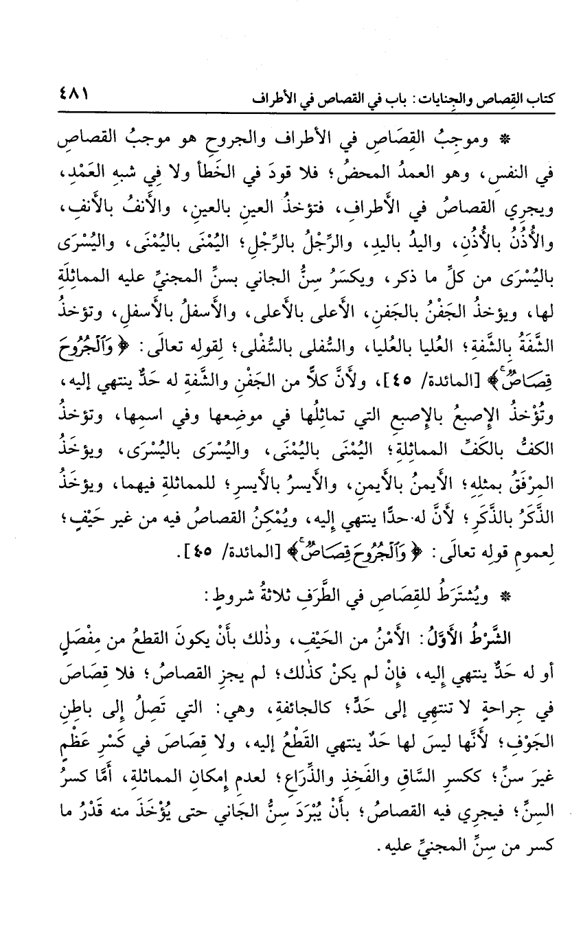 وموجب القصاص في الأطراف والجروح هو موجب القصاص في النفس، وهو العمد المحض؛ فلا قود في الخطأ ولا في شبه العمد، ويجري القصاص في الأطراف، فتؤخذ العين بالعين، والأنف بالأنف، والأذن بالأذن، واليد باليد، والرجل بالرجل، واليمنى باليمنى، واليسرى باليسرى، من كل ما ذكر، ويكسر سن الجاني بسن المجني عليه المماثلة لها، ويؤخذ الجفن بالجفن، الأعلى بالأعلى، والأسفل بالأسفل، وتؤخذ الشفة بالشفة؛ العليا بالعليا، والسفلى بالسفلى؛ لقوله تعالى: {وَالْجُرُوحَ قِصَاص} ، ولأن كلا من الجفن والشفة له حد ينتهي إليه، وتؤخذ الكف بالكف المماثلة؛ اليمنى باليمنى، واليسرى باليسرى، ويؤخذ المرفق بمثله؛ الأيمن بالأيمن، والأيسر بالأيسر؛ للماثلة فيهما، ويؤخذ الذكر بالذكر؛ لأن له حذًا ينتهي إليه، ويمكن القصاص فيه من غير حيف؛ لعموم قوله تعالى: {وَالْجُرُوحَ قِصَاص} .