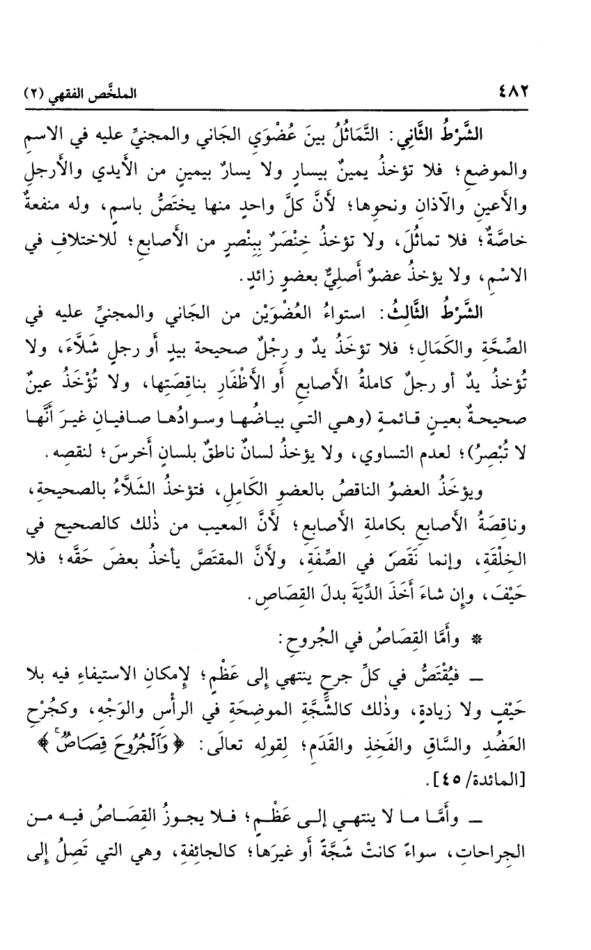 الشرط الثاني: التماثل بين عضوي الجاني والمجني عليه في الاسم والموضع؛ فلا تؤخذ يمين بيسار ولا يسار بيمين الأيدي والأرجل والأعين والآذان ونحوها؛ لأن كل واحد منها يختص باسم، وله منفعة خاصة؛ فلا تماثل، ولا تؤخذ خنصر ببنصر من الأصابع؛ للاختلاف في الاسم، ولا يؤخذ عضو أصلي بعضو زائد.