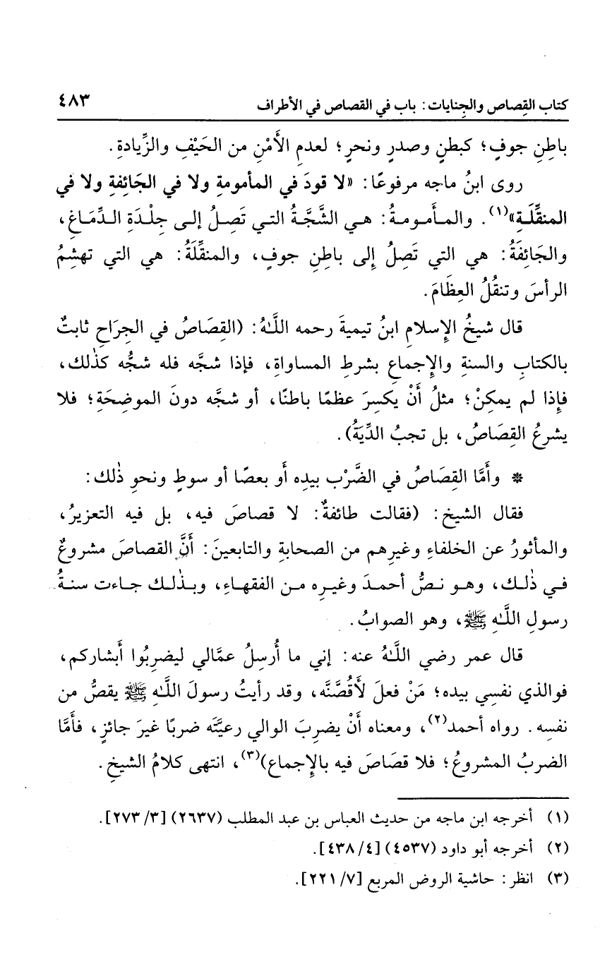 قال شيخ: "فقالت طائفة: لا قصاص فيه، بل فيه التعزير، والمأثور عند الخلفاء وغيرهم من الصحابة والتابعين: أن القصاص مشروع في ذلك، وهو نص أحمد وغيره من الفقهاء، وبذلك جاءت سنة رسول الله صلى الله عليه وسلم، وهو الصواب.