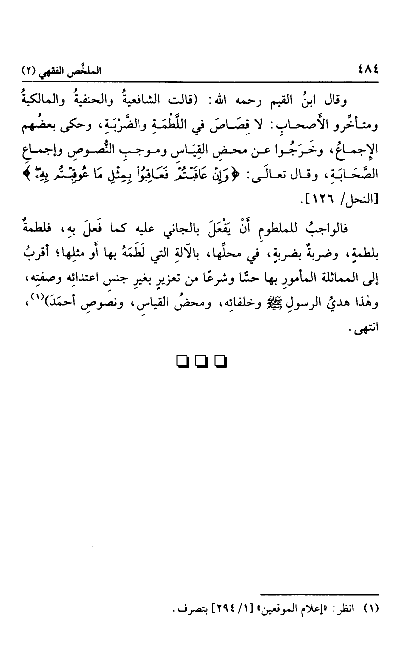 وقال ابن القيم رحمه الله: "قال الشافعية والحنفية والمالكية ومتأخرو الأصحاب: لا قصاص في اللطمة والضربة، وحكى بعضهم الإجماع، وخرجوا عن محض القياس وموجب النصوص وإجماع الصحابة، وقال تعالى: {وَإِنْ عَاقَبْتُمْ فَعَاقِبُوا بِمِثْلِ مَا عُوقِبْتُمْ بِهِ} .