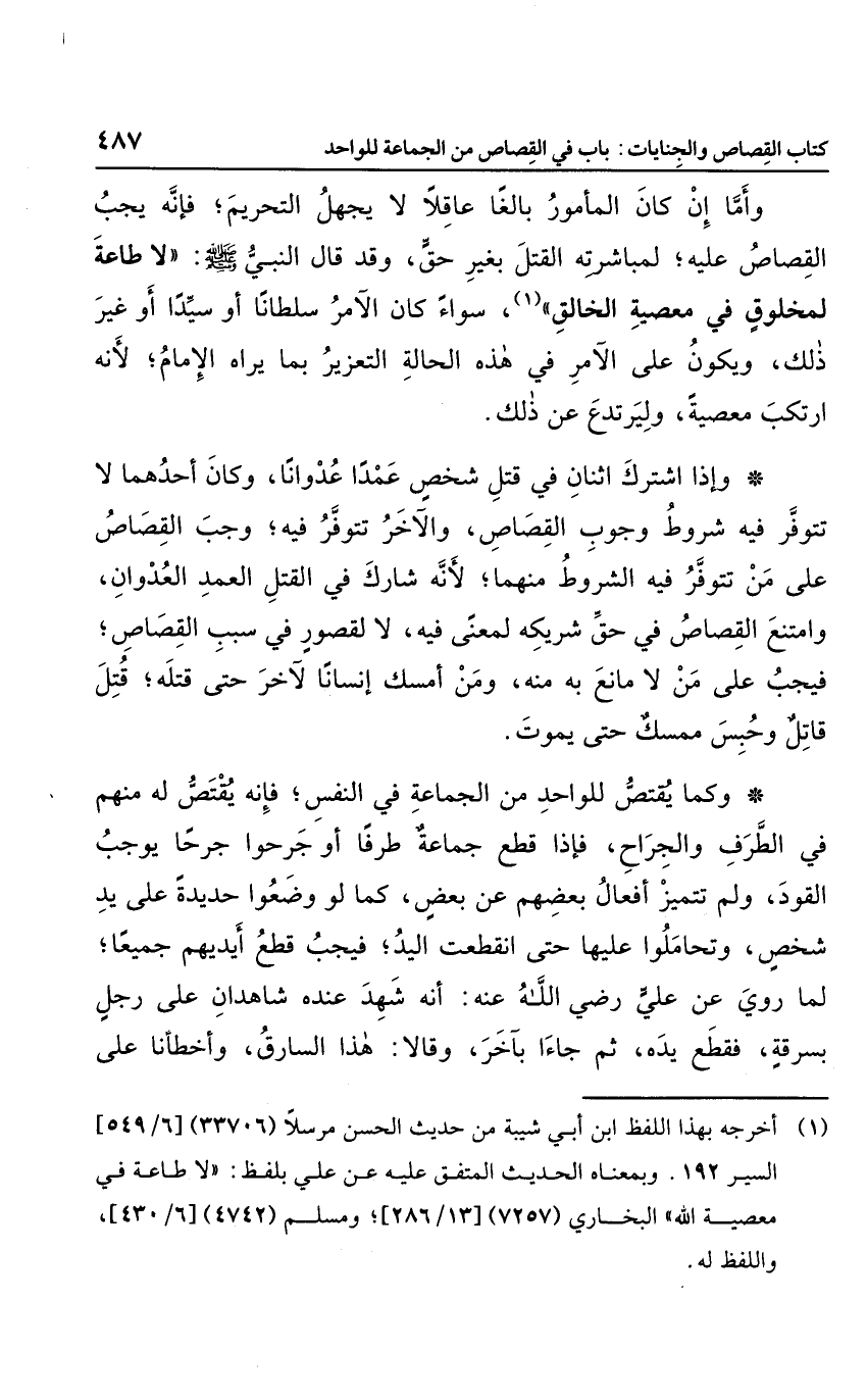 وأما إن كان المأمور بالغا عاقلاً لا يجهل التحريم؛ فإنه يجب القصاص عليه؛ لمباشرته القتل بغير حق، وقد قال النبي صلى الله عليه وسلم: "لا طاعة لمخلوق في معصية الخالق"، سواء كان الآمر سلطانا أو سيدًا أو غير ذلك، ويكون على الآمر في هذه الحالة التعزير بما يراه الإمام؛ لأنه ارتكب معصية، وليرتدع عن ذلك.