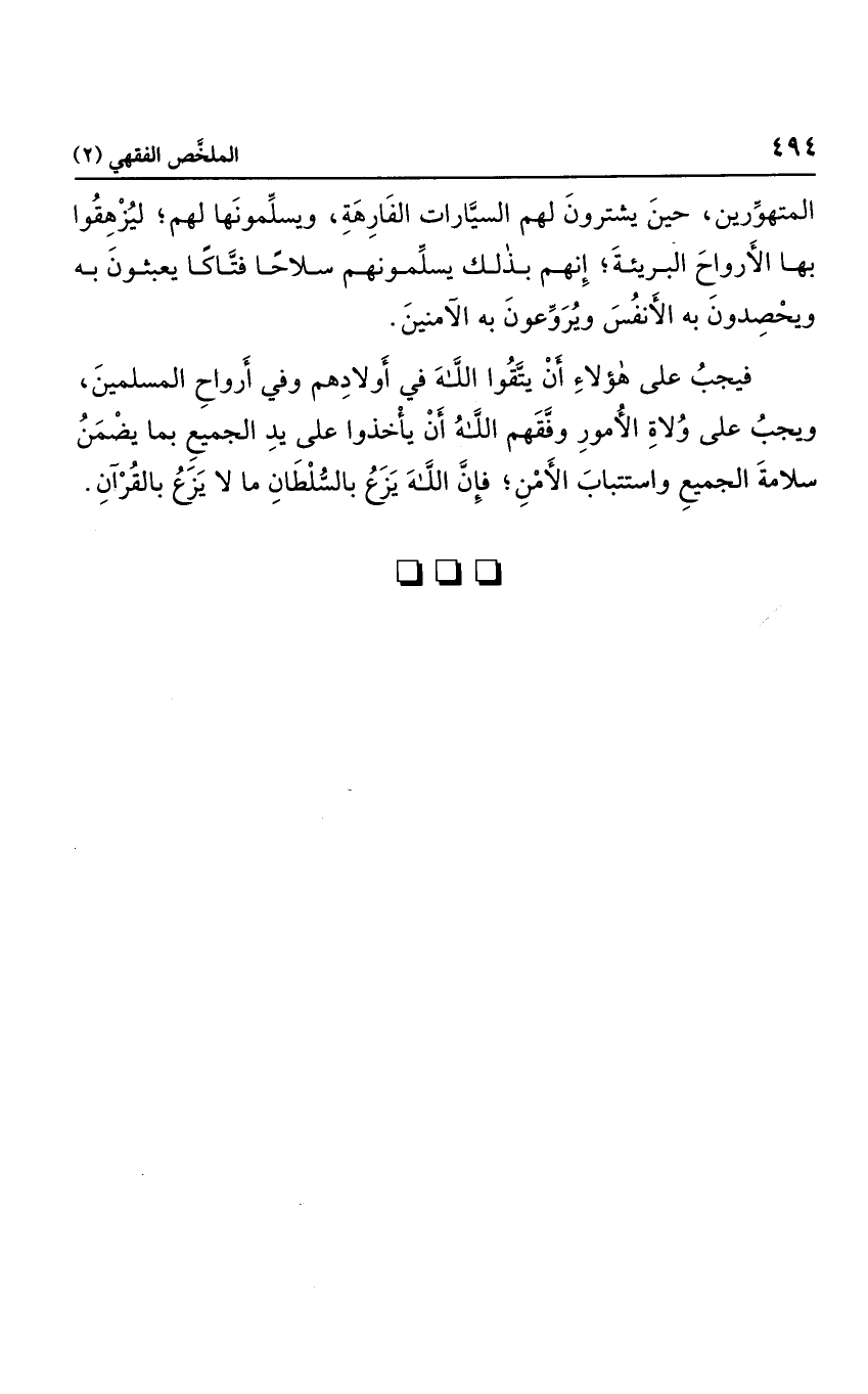 فيجب على هؤلاء أن يتقوا الله في أولادهم وفي أرواح المسلمين، ويجب على ولاة الأمور وفقهم الله أن يأخذوا على يد الجميع بما يضمن سلامة الجميع واستتباب الأمن؛ فإن الله يزع بالسلطان ملا يزع بالقرآن.