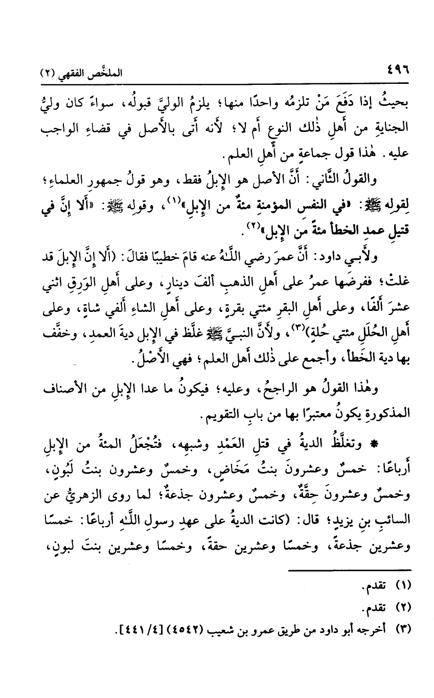 والقول الثاني أن الأصل هو الإبل فقط، وهو قول جمهور العلماء لقوله صلى الله عليه وسلم: "في النفس المؤمنة مئة من الإبل"، وقوله صلى الله عليه وسلم: "ألا إن في قتيل عمد الخطأ مئة من الإبل".