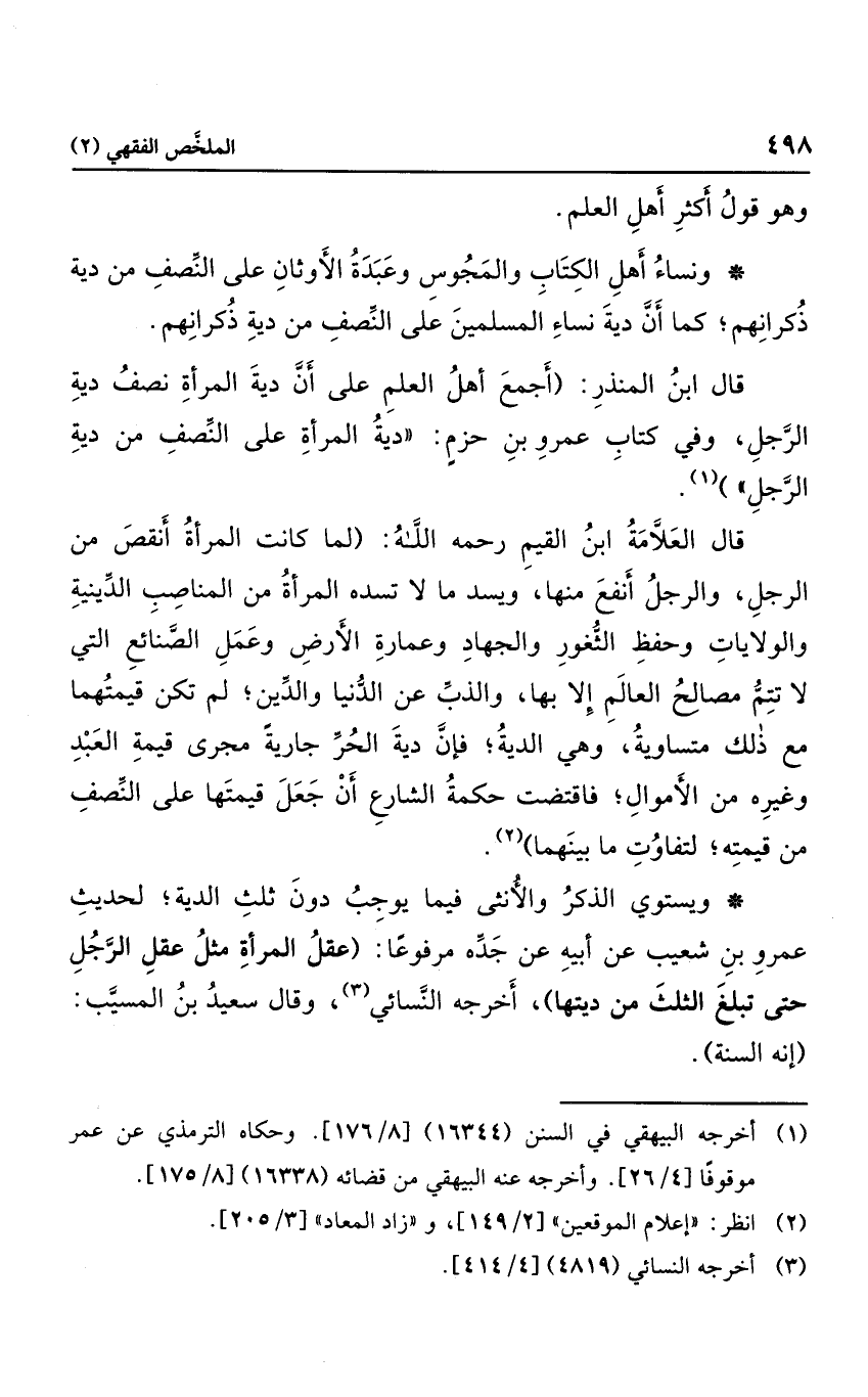 ونساء أهل الكتاب والمجوس وعبدة الأوثان على النصف من دية ذكرانهم؛ كما أن دية نساء المسلمين على النصف من دية ذكرانهم.