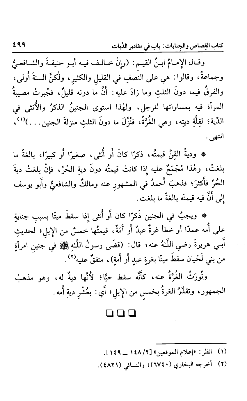 وقال الإمام ابن القيم: "وإن خالف فيه أبو حنيفة والشافعي وجماعة، وقالوا: هي على النصف في القليل والكثير، ولكن السنة أولى، والفرق فيما دون الثلث وما زاد عليه؛ أن ما دونه قليل، فجبرت مصيبة المرأة فيه بمساواتها للرجل، ولهذا استوى الجنين الذكر والأنثى في الدية؛ لقلة ديته، وهي الغرة، فنزل ما دون الثلث منزلة الجنين ... " انتهى.