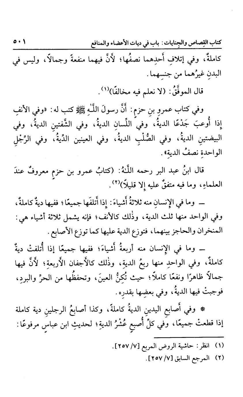 وفي كتاب عمرو بن حزم؛ أن رسول الله صلى الله عليه وسلم كتب له: "وفي الأنف إذا أوعب جدعا الدية، وفي اللسان الدية، وفي الشفتين الدية، وفي البيضتين الدية، وفي الصلب الدية، وفي العينين الدية، وفي الرجل الواحدة نصف الدية".