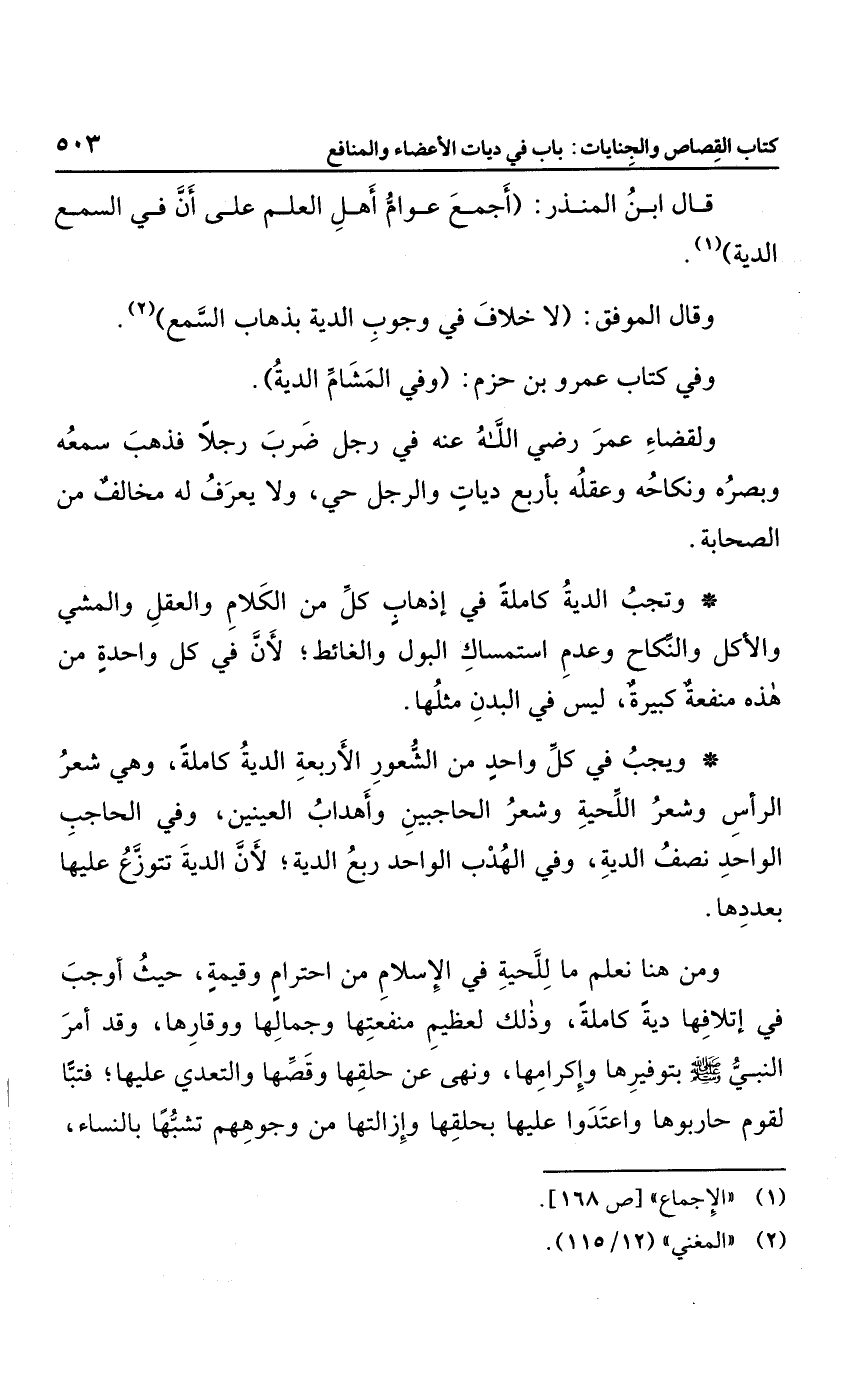 وقال الموفق: "لا خلاف في وجوب الدية بذهاب السمع".