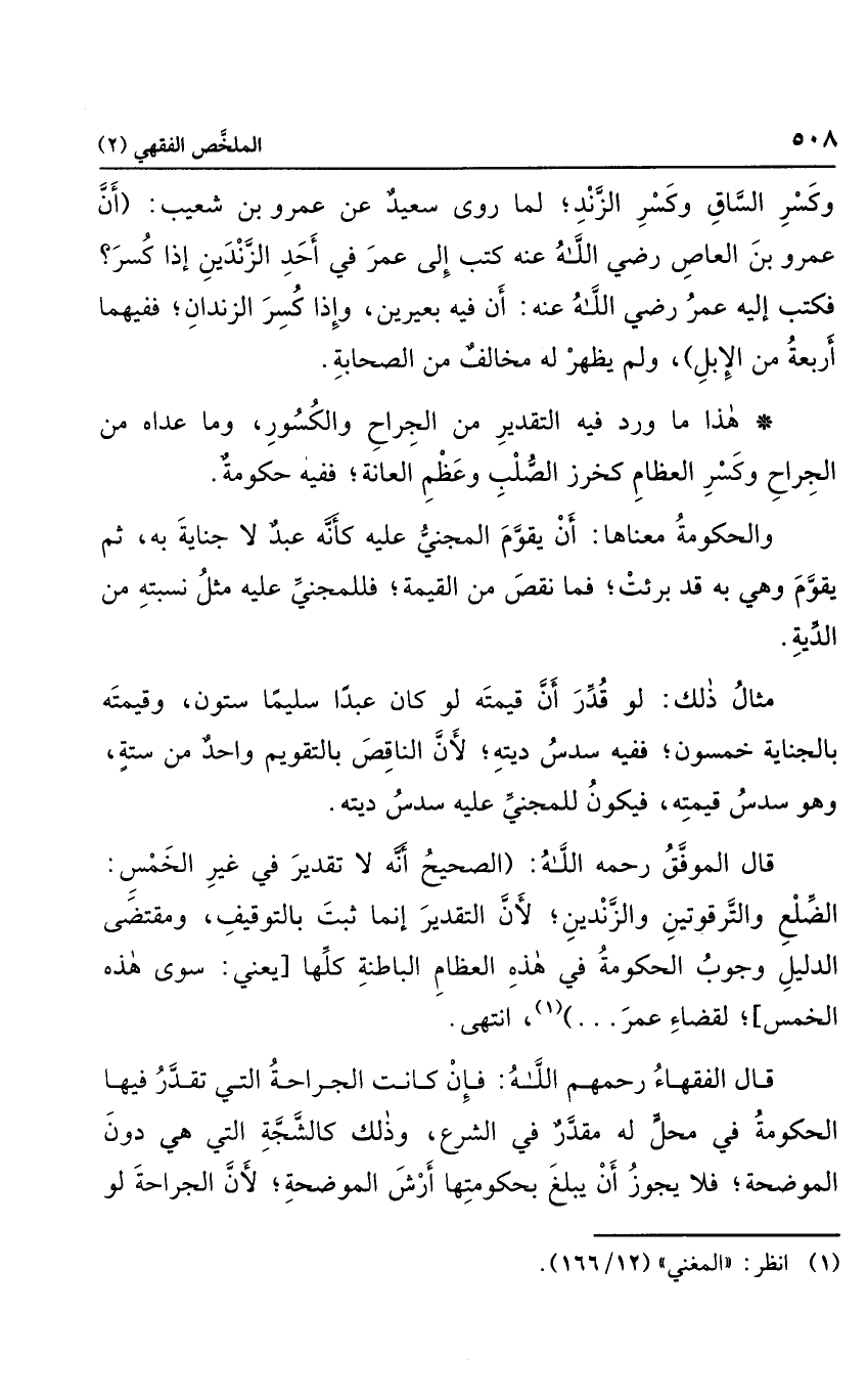 وهذا ما ورد فيه التقدير من الجراح والكسور، وما عداه من الجرح وكسر العظام كخرز الصلب وعظم العانة؛ ففيه حكومة.