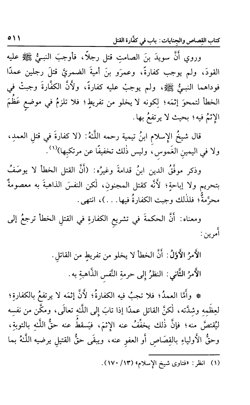 وروي أن سويد بن الصامت قتل رجلاً، فأوجب النبي صلى الله عليه وسلم عليه القود، ولم يوجب كفارة، وعمرو بن أمية الضمري قتل رجلين عمدًا، فوداهما النبي صلى الله عليه وسلم، ولم يوجب عليه كفارة، ولأن الكفارة وجبت في الخطأ لتمحو إثمه؛ لكونه لا يخلو من تفريط؛ فلا تلزم في موضع عظم الإثم فيه؛ بحيث لا يرتفع بها.