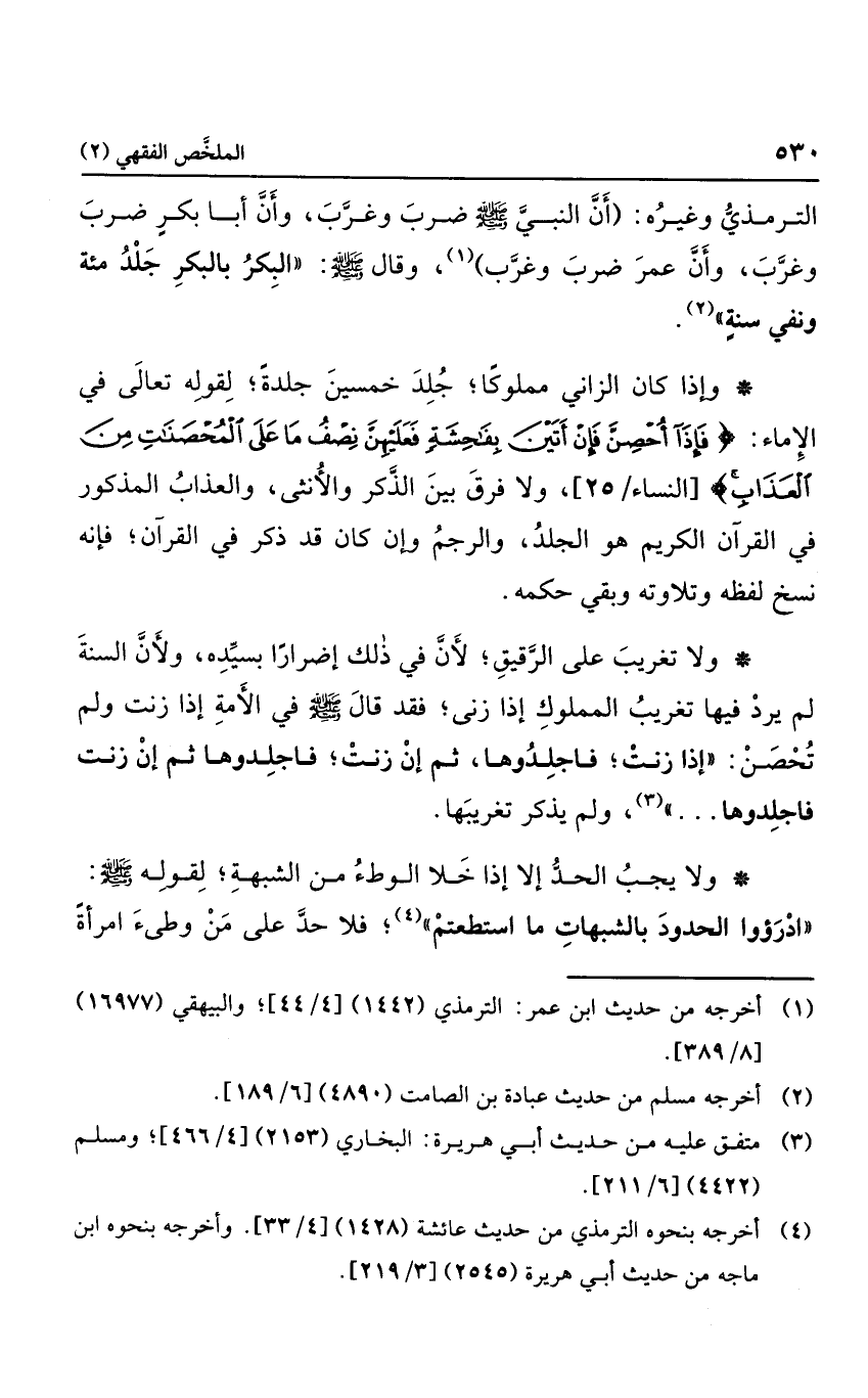 الترمذي وغيره: "أن النبي صلى الله عليه وسلم ضرب وغرب، وأن أبا بكر ضرب وغرب، وأن عمر ضرب وغرب"، وقال صلى الله عليه وسلم: "البكر بالبكر جلد مئة وتغريب عام".