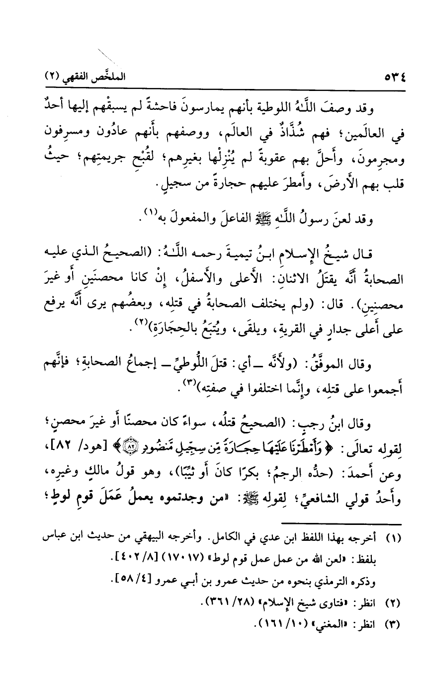 قال: "ولم يختلف الصحابة في قتله، وبعضهم يرى أنه يرفع على أعلى جدار في القرية، ويلقى، ويتبع بالحجارة".