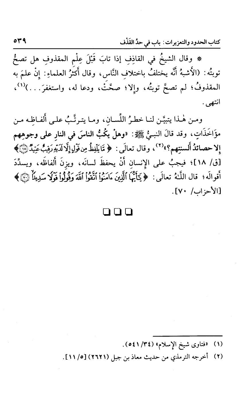 ومن هذا يتبين لنا خطر اللسان، وما يترتب على ألفاظه من مؤاخذات، وقد قال النبي صلى الله عليه وسلم: "وهل يكب الناس في النار على وجوههم إلا حصائد ألسنتهم"، وقال تعالى: {مَا يَلْفِظُ مِنْ قَوْلٍ إِلَّا لَدَيْهِ رَقِيبٌ عَتِيدٌ} . فيجب على الإنسان أن يحفظ لسانه، ويزن ألفاظه، ويسدد أقواله؛ قال الله تعالى: {يَا أَيُّهَا الَّذِينَ آمَنُوا اتَّقُوا اللَّهَ وَقُولُوا قَوْلاً سَدِيداً} .