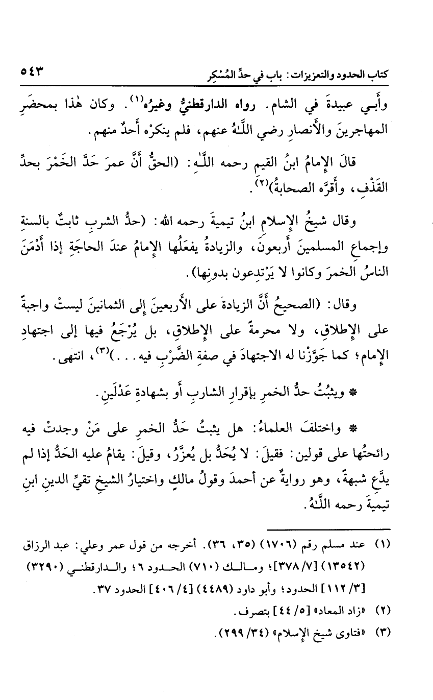 وقال شيخ الإسلام ابن تيمية رحمه الله: "حد الشرب ثابت بالسنة وإجماع المسلمين أربعون، والزيادة يفعلها الإمام عند الحاجة إذا أدمن الناس الخمر وكانوا لا يرتدعون بدونها".