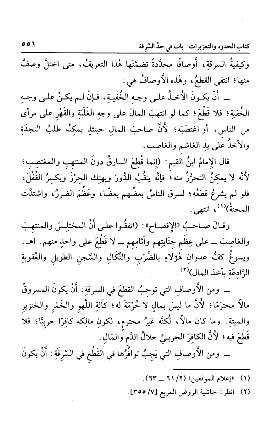 ومن الأوصاف التي توجب القطع في السرقة: أن يكون المسروق مالاً محترما؛ لأن ما ليس بمال لا حرمة له؛ كآلة اللهو والخمر والخنزير والميتة، وما كان مالاً، لكنه غير محترم، لكون مالكه كافرًا حربيا؛ فلا قطع فيه؛ لأن الكافر الحربي حلال الدم والمال.