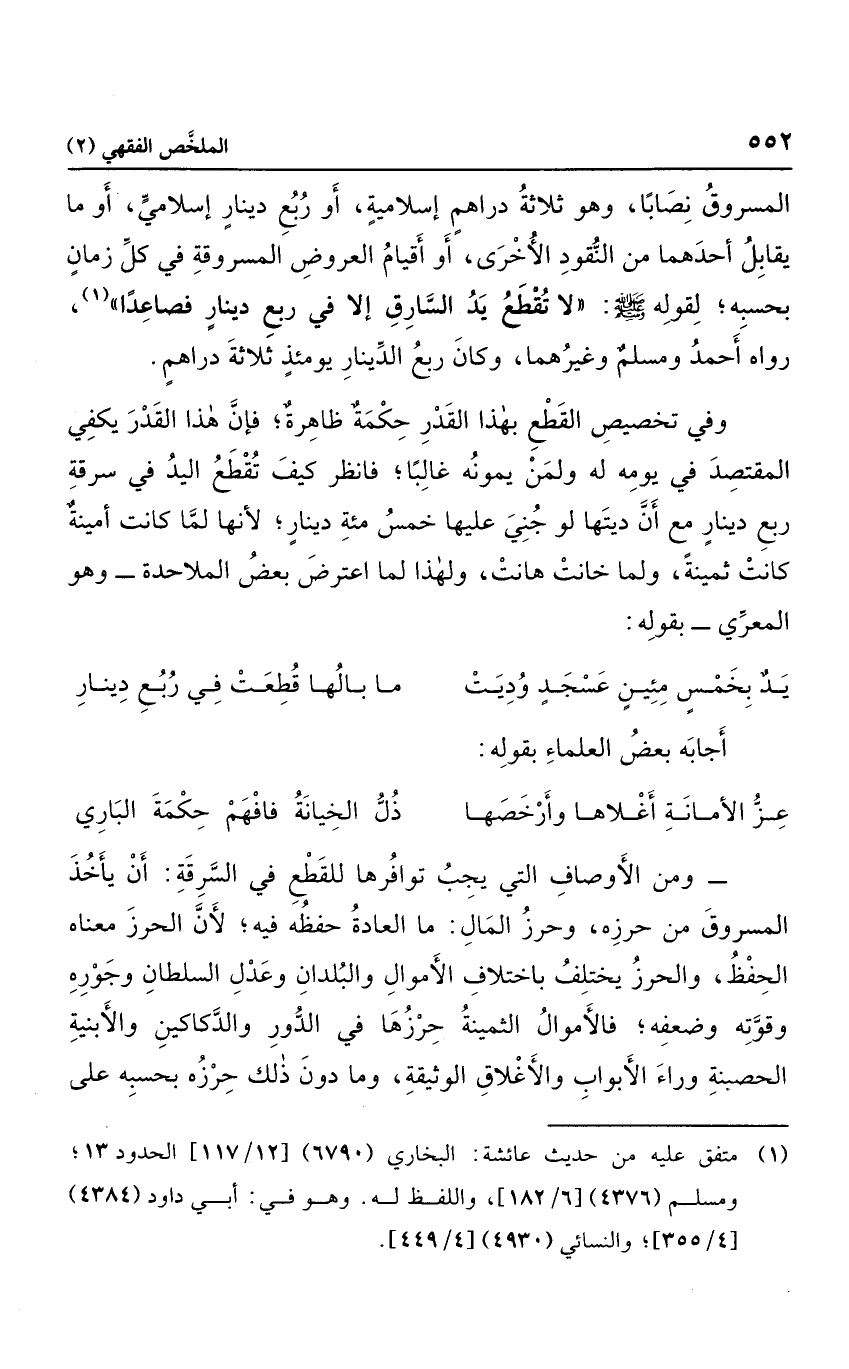 المسروق نصابا، وهو ثلاثة دراهم إسلامية، أو أربع دينار إسلامي، أو ما يقابل أحدهما من النقود الأخرى، أو أقيام العروض المسروقة في كل زمان بحسبه؛ لقوله صلى الله عليه وسلم: "لا تقطع اليد إلا في ربع دينا فصاعدا"، رواه أحمد ومسلم وغيرهما، وكان ربع الدينار يومئذ ثلاثة دراهم.