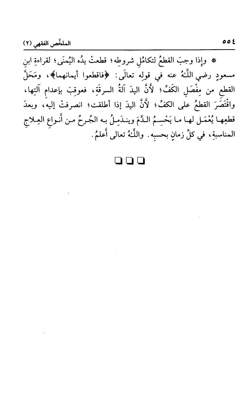 وإذا وجب القطع لتكامل شروطه؛ قطعت يده اليمنى؛ لقراءة ابن مسعود في قوله تعالى: {فاقطعوا أيمانهما} ، ومحل القطع من مفصل الكف؛ لأن اليد آلة السرقة، فعوقب بإعدام آلتها، واقتصر القطع على الكف؛ لأن اليد إذا أطلقت؛ انصرفت إليه، وبعد قطعها يعمل لها ما يحسم الدم ويندمل به الجرح من أنواع العلاج المناسبة في كل زمان بحسبه.
