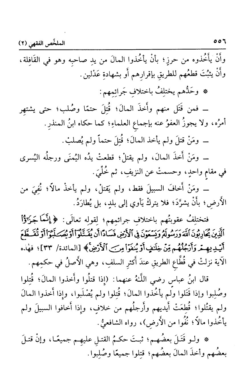 قال ابن عباس رضي الله عنهما: "إذا قتلوا وأخذوا المال؛ قتلوا وصلبوا، وإذا قتلوا يأخذوا المال؛ قتلوا ولم يصلبوا، وإذا أخذوا المال ولم يقتلوا؛ قطعت لأيديهم وأرجلهم من خلاف، وإذا أخافوا السبيل ولم يأخذوا مالاً؛ نفوا من الأرض"، رواه الشافعي.