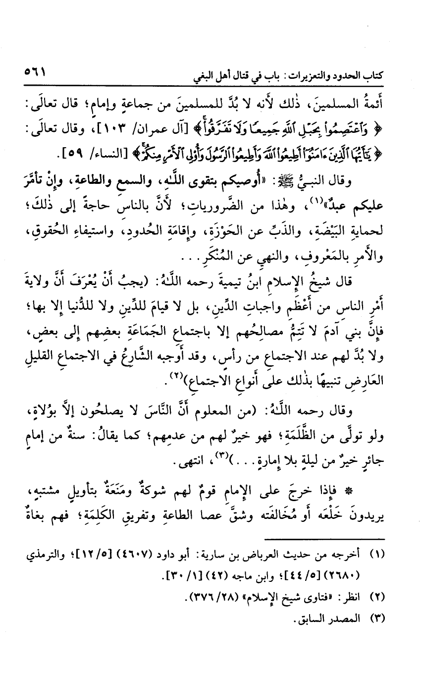قال شيخ الإسلام ابن تيمية رحمه الله: "يجب أن يعرف أن ولاية أمر المسلمين من أعظم واجبات الدين، بل لا قيام للدين ولا الدنيا إلا بها؛ فإن بني آدم لا تتم مصالحهم إلا باجتماع الجماعة بعضهم إلى بعض، ولا بد لهم عند الاجتماع من رأس، وقد أجبه الشارع في الاجتماع القليل العارض؛ تنبيها بذلك على أنواع الاجتماع".