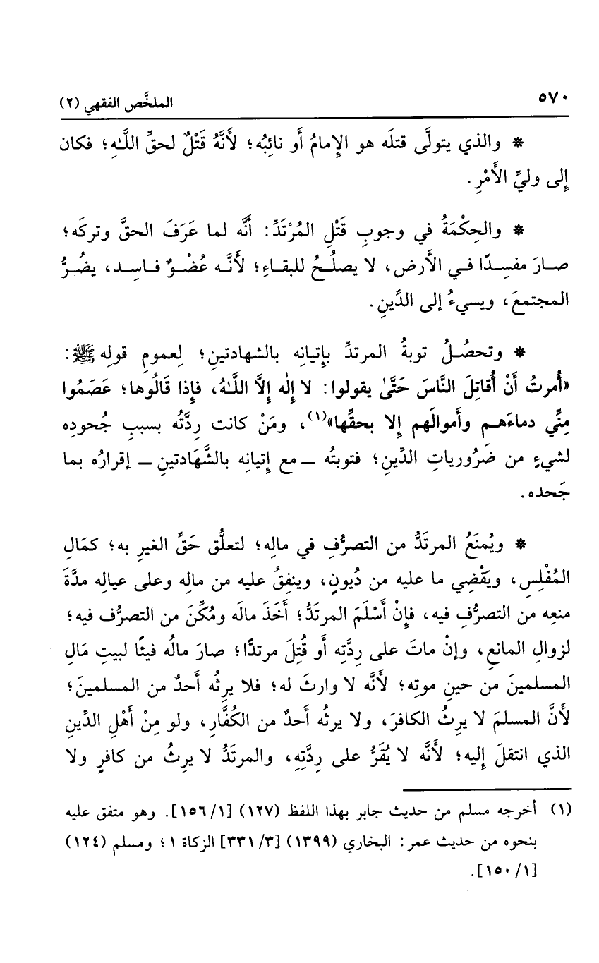 ويمنع المرتد من التصرف في ماله؛ لتعلق حق الغير به؛ كمال المفلس، ويقضى ما عليه من ديون، وينفق عليه من ماله وعلى عياله مدة منعه من التصرف فيه، فإن أسلم المرتد؛ أخذ ماله ومكن من التصرف فيه لزوال المانع، وإن مات على ردته أو قتل مرتدًا؛ صار ماله فيئا لبيت مال المسلمين من حين موته؛ لأنه لا وراث له؛ فلا يرثه أحد من المسلمين؛ لأن المسلم لا يرث الكافر، ولا يرثه أحد من الكفار، ولو من أهل الدين انتقل إليه؛ لأنه لا يقر على ردته، والمرتد لا يرث من كافر ولا