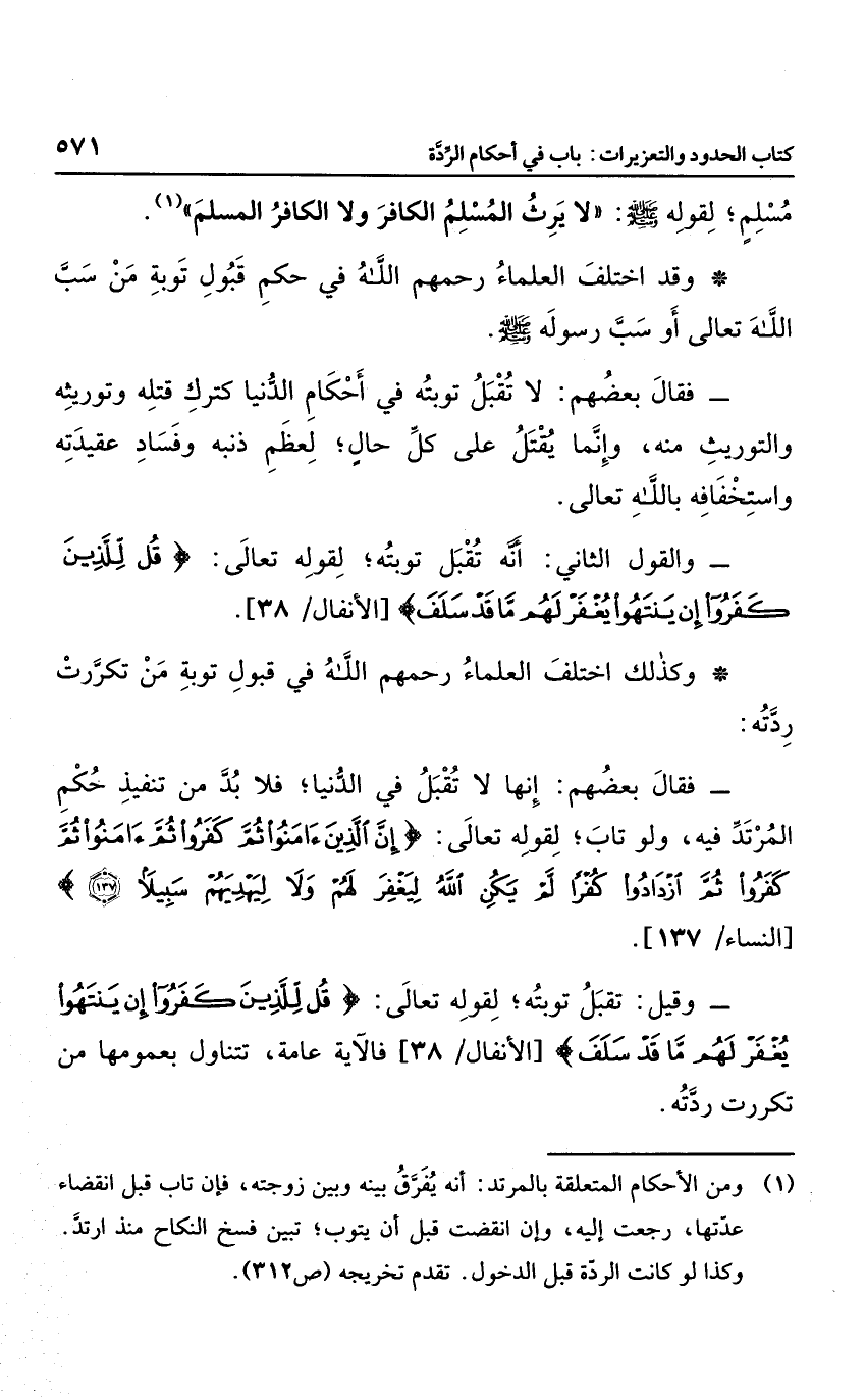 وقيل: تقبل توبته؛ لقوله تعالى: {قُلْ لِلَّذِينَ كَفَرُوا إِنْ يَنْتَهُوا يُغْفَرْ لَهُمْ مَا قَدْ سَلَفَ} ؛ فالآية عامة، تتناول بعمومها من تكررت ردته.