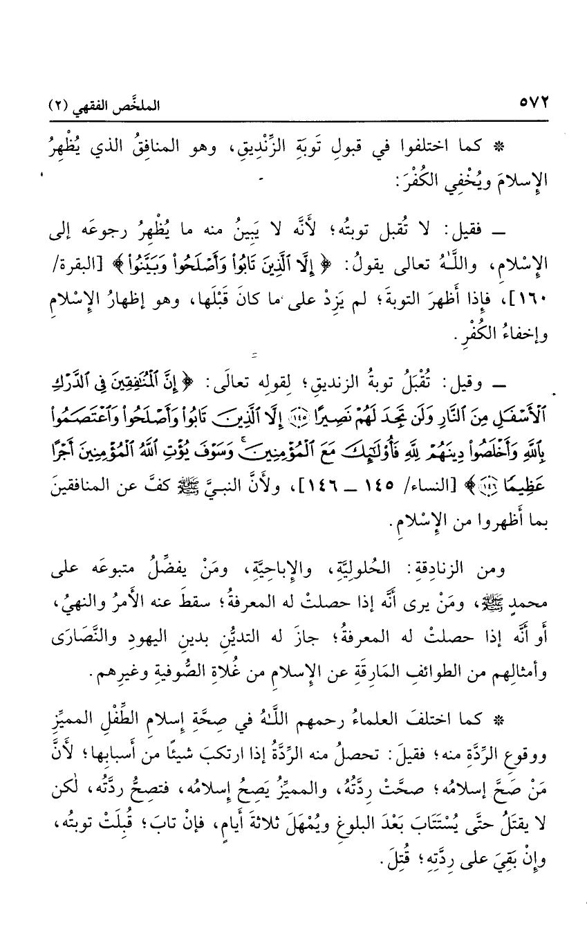 وقيل: تقبل توبة الزنديق؛ لقوله تعالى: {إِنَّ الْمُنَافِقِينَ فِي الدَّرْكِ الأَسْفَلِ مِنَ النَّارِ وَلَنْ تَجِدَ لَهُمْ نَصِيرا إِلاّ الَّذِينَ تَابُوا وَأَصْلَحُوا وَاعْتَصَمُوا بِاللَّهِ وَأَخْلَصُوا دِينَهُمْ لِلَّهِ فَأُولَئِكَ مَعَ الْمُؤْمِنِينَ وَسَوْفَ يُؤْتِ اللَّهُ الْمُؤْمِنِينَ أَجْراً عَظِيماً} ، ولأن النبي صلى الله عليه وسلم كف عن المنافقين بما أظهروا من الإسلام.