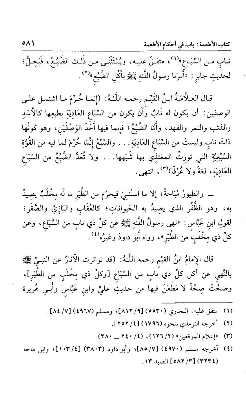 قال الإمام ابن القيم رحمه الله: "قد تواترت الآثار عن النبي صلى الله عليه وسل بالنهي عن كل ذي ناب من السباع وكل ذي مخلب من الطير، وصحت صحة لا مطعن فيها من حديث على وابن عباس وأبي هريرة