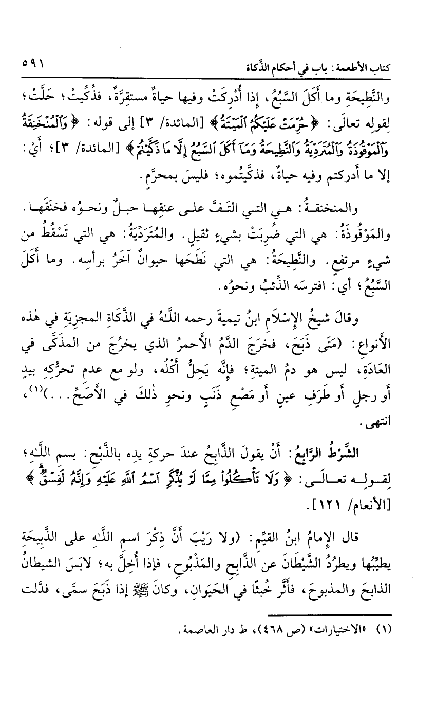 والنطيحة وما أكل السبع، إذا أدركت وفيها حياة مستقرة، فذكيت؛ حلّت؛ لقوله تعالى: {حُرِّمَتْ عَلَيْكُمُ الْمَيْتَةُ ... } إلى قوله: {وَالْمُنْخَنِقَةُ وَالْمَوْقُوذَةُ وَالْمُتَرَدِّيَةُ وَالنَّطِيحَةُ وَمَا أَكَلَ السَّبُعُ إِلَّا مَا ذَكَّيْتُمْ} ؛ أي: إلا ما أدركتم وفيه حياة، فذكيتموه؛ فليس بمحرم.