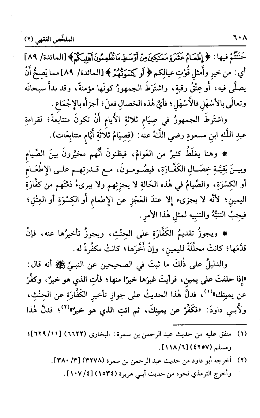 وهنا يغلط كثير من العوام، فيظنون أنهم مخيرون بين الصيام وبين بقية خصال الكفارة، فيصومون، مع قدرتهم على الإطعام أو الكسوة، والصيام في هذه الحالة لا يجزئهم ولا يبرىء ذمتهم من كفارة اليمين؛ لأنه لا يجزىء إلا عند العجز عن الإطعام أو الكسوة أو العتق؛ فيجب التنبيه لمثل هذا الأمر.