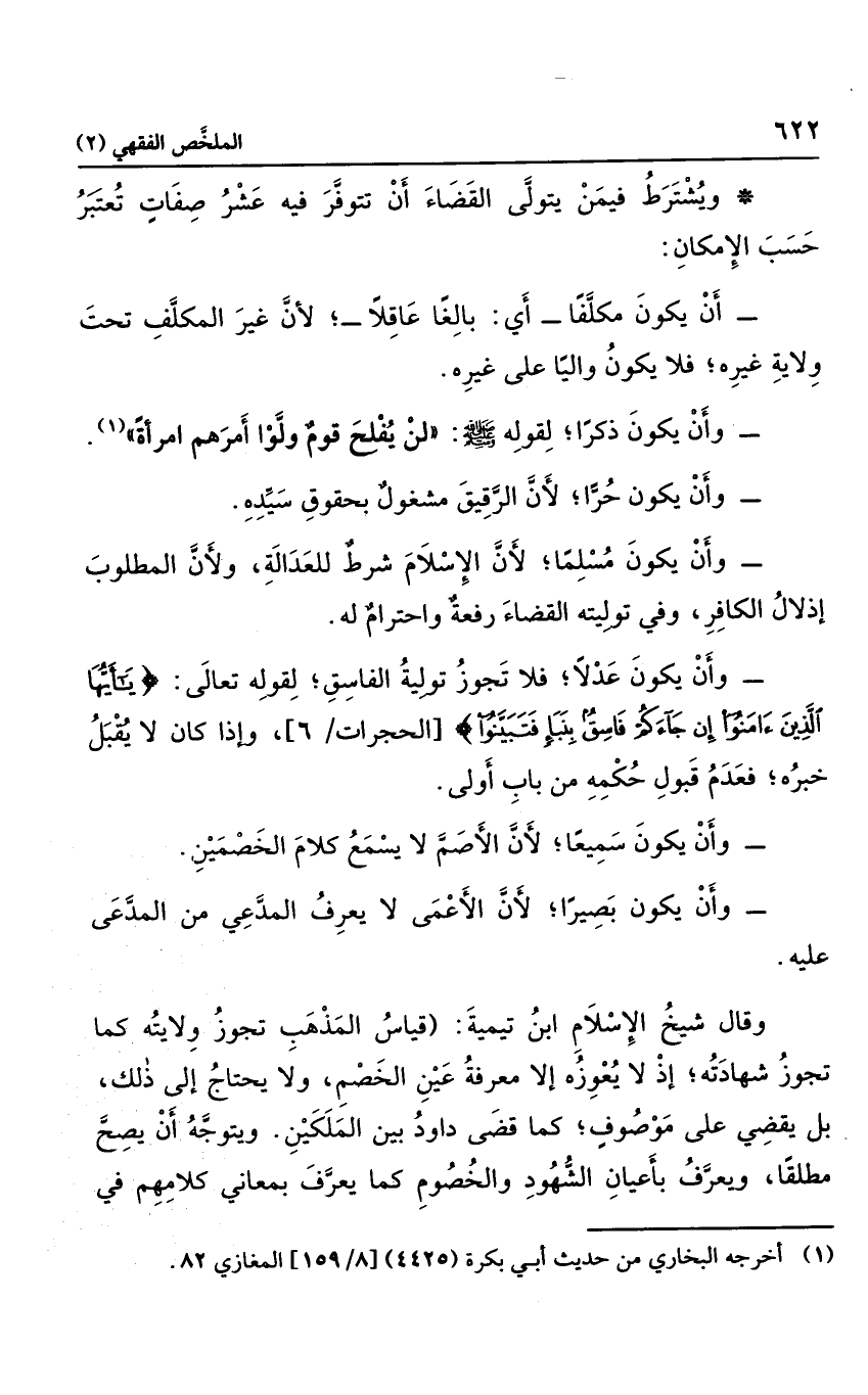 وأن يكون عدلاً؛ فلا تجوز توليه الفاسق؛ لقوله تعالى: {يَا أَيُّهَا الَّذِينَ آمَنُوا إِنْ جَاءَكُمْ فَاسِقٌ بِنَبَأٍ فَتَبَيَّنُوا} ، وإذا كان لا يقبل خبره؛ فعدم قبول حكمه من باب أولى.
