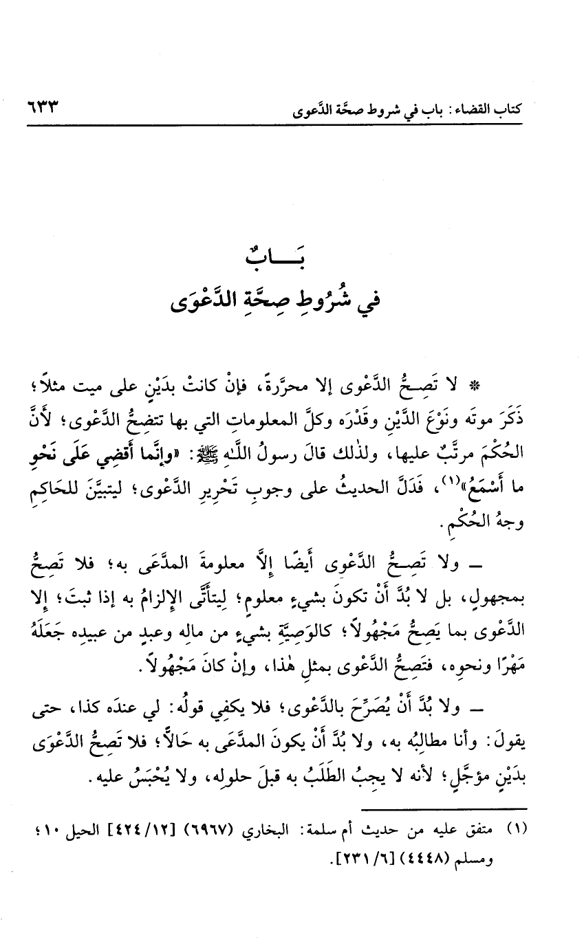 لا تصح الدعوى إلا محررة، فإن كانت بدين على ميت مثلاً؛ ذكر موته ونوع الدين وقدره وكل المعلومات التي بها تتضح الدعوى؛ لأن الحكم مرتب عليها، ولذلك قال رسول الله صلى الله عليه وسلم "وإنما أقضي على نحو ما أسمع"، فدل الحديث على وجوب تحير الدعوى؛ ليتبين للحاكم وجه الحكم.