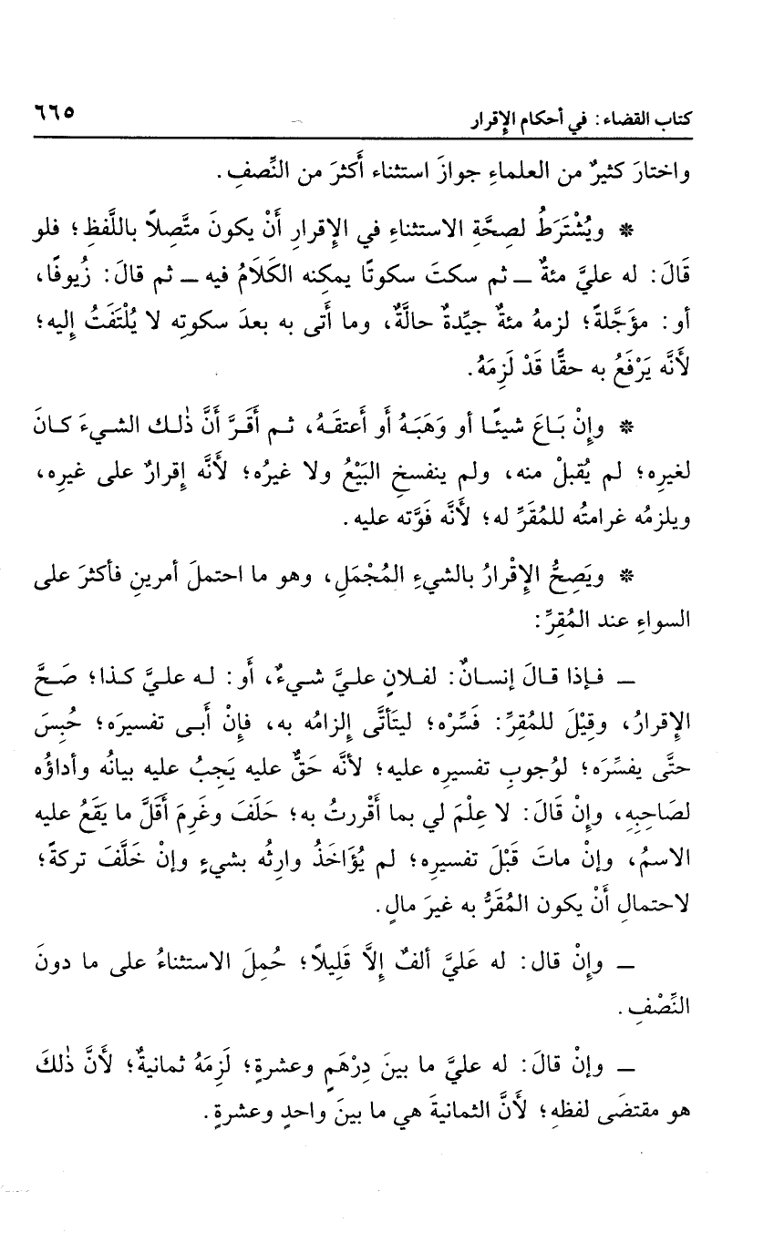 ويشترط لصحة الاستثناء في الإقرار: أن يكون متصلاً باللفظ؛ فلو قال: له علىَّ مئة، ثم سكت سكوتا يمكنه الكلام فيه، ثم قال: زيوفا، أو: مؤجلة؛ لزمه مئة جيدة حالة، وما أتى به بعد سكوته لا يلتفت إليه؛ لأنه يرفع به حقا قد لزمه.