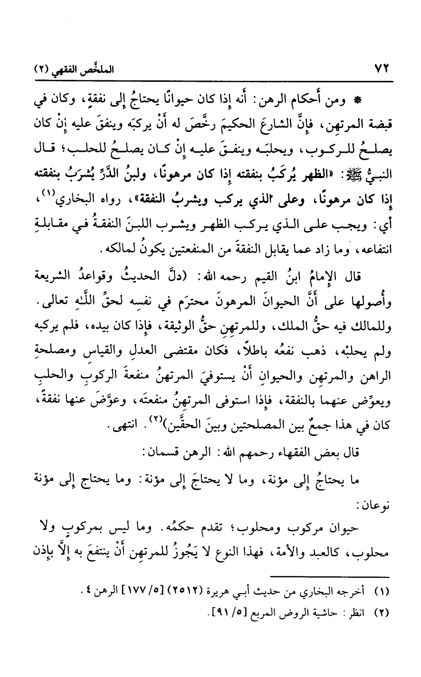 قال الإمام ابن القيم رحمه الله: "دل الحديث وقواعد الشريعة وأصولها على أن الحيوان المرهون محترم في نفسه لحق الله تعالى، وللمالك فيه حق الملك، وللمرتهن حق الوثيقة، فإذا كان بيده، فلم يحلبه؛ ذهب نفعه باطلاً، فكان مقتضى العدل والقياس ومصلحة الراهن والمرتهن والحيوان أن يستوفي المرتهن منفعة الركوب والحلب ويعوض عنهما بالنفقة، فإذا استوفى المرتهن منفعته، وعوض عنها نفقة، كان في هذا جمع بين المصلحتين وبين الحقين" انتهى.
