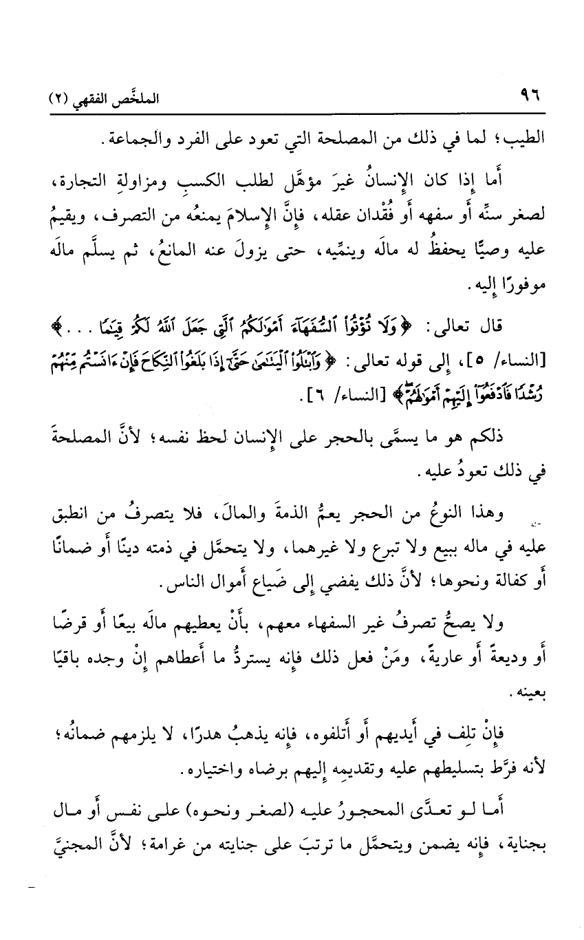 قال تعالى: {وَلا تُؤْتُوا السُّفَهَاءَ أَمْوَالَكُمُ الَّتِي جَعَلَ اللَّهُ لَكُمْ قِيَاماً} إلى قوله تعالى: {وَابْتَلُوا الْيَتَامَى حَتَّى إِذَا بَلَغُوا النِّكَاحَ فَإِنْ آنَسْتُمْ مِنْهُمْ رُشْداً فَادْفَعُوا إِلَيْهِمْ أَمْوَالَهُمْ} .