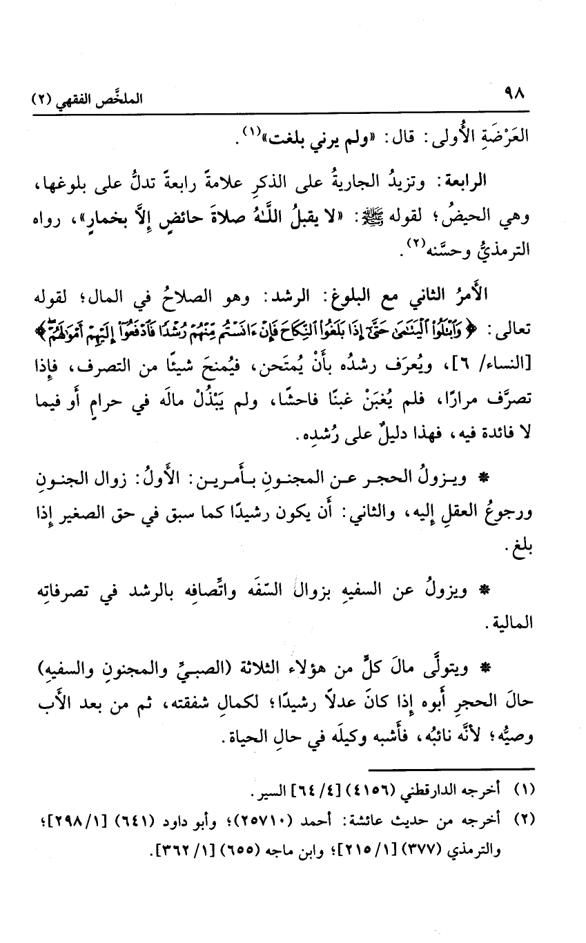 الأمر الثاني من البلوغ: الرشد، وهو الصلاح في المال؛ لقوله تعالى: {وَابْتَلُوا الْيَتَامَى حَتَّى إِذَا بَلَغُوا النِّكَاحَ فَإِنْ آنَسْتُمْ مِنْهُمْ رُشْداً فَادْفَعُوا إِلَيْهِمْ أَمْوَالَهُمْ} .