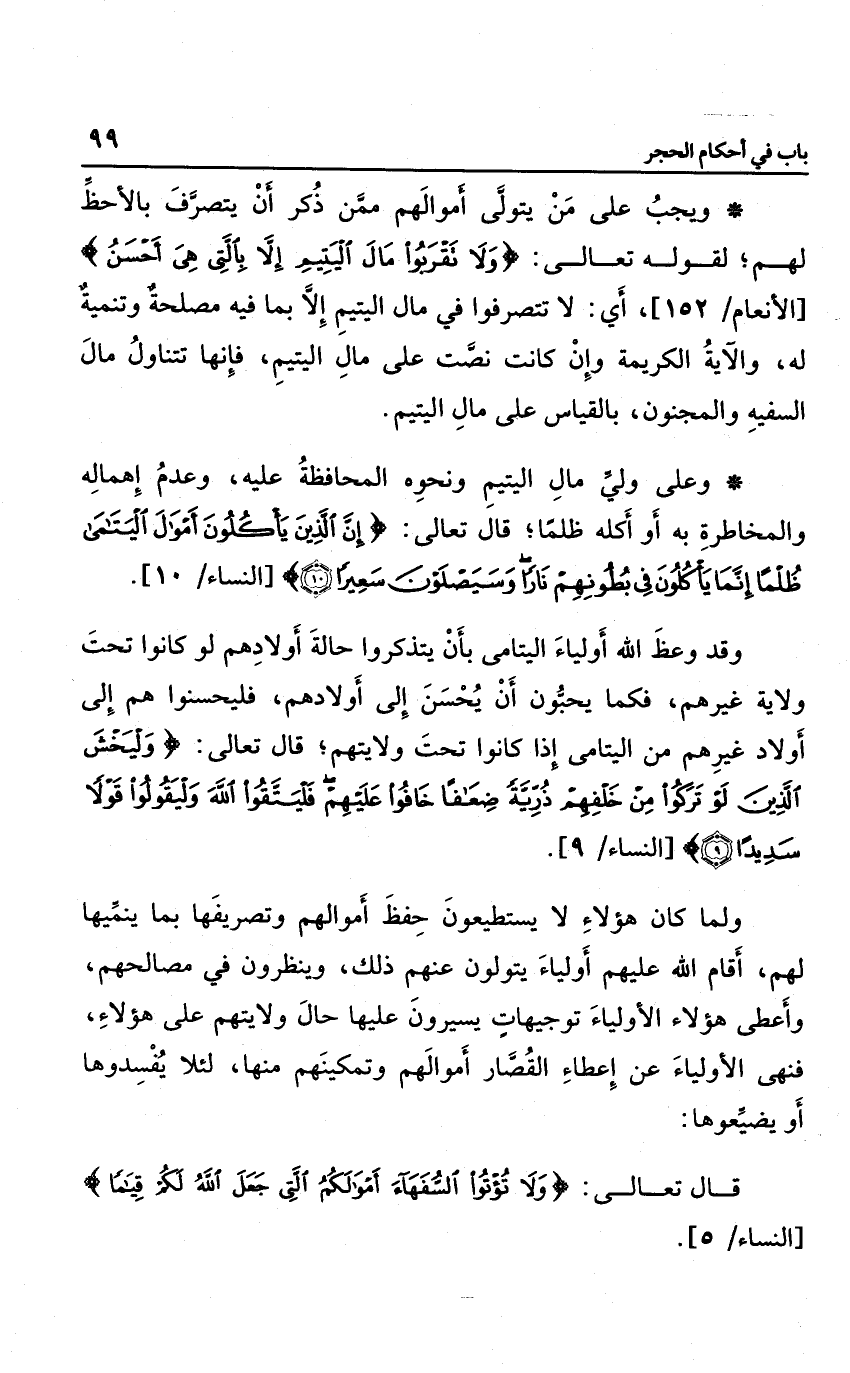 ويجب على من يتولى أموالهم ممَّن ذكر أن يتصرف لهم بالأحظ لهم؛ لقوله تعالى: {وَلا تَقْرَبُوا مَالَ الْيَتِيمِ إِلاّ بِالَّتِي هِيَ أَحْسَنُ} ؛ أي: لا تتصرفوا في مال اليتيم إلا بما فيه مصلحة وتنمية له، والآية الكريمة وإن كانت نصت على مال اليتيم؛ فإنها تتناول مال السفيه بالقياس على مال اليتيم.