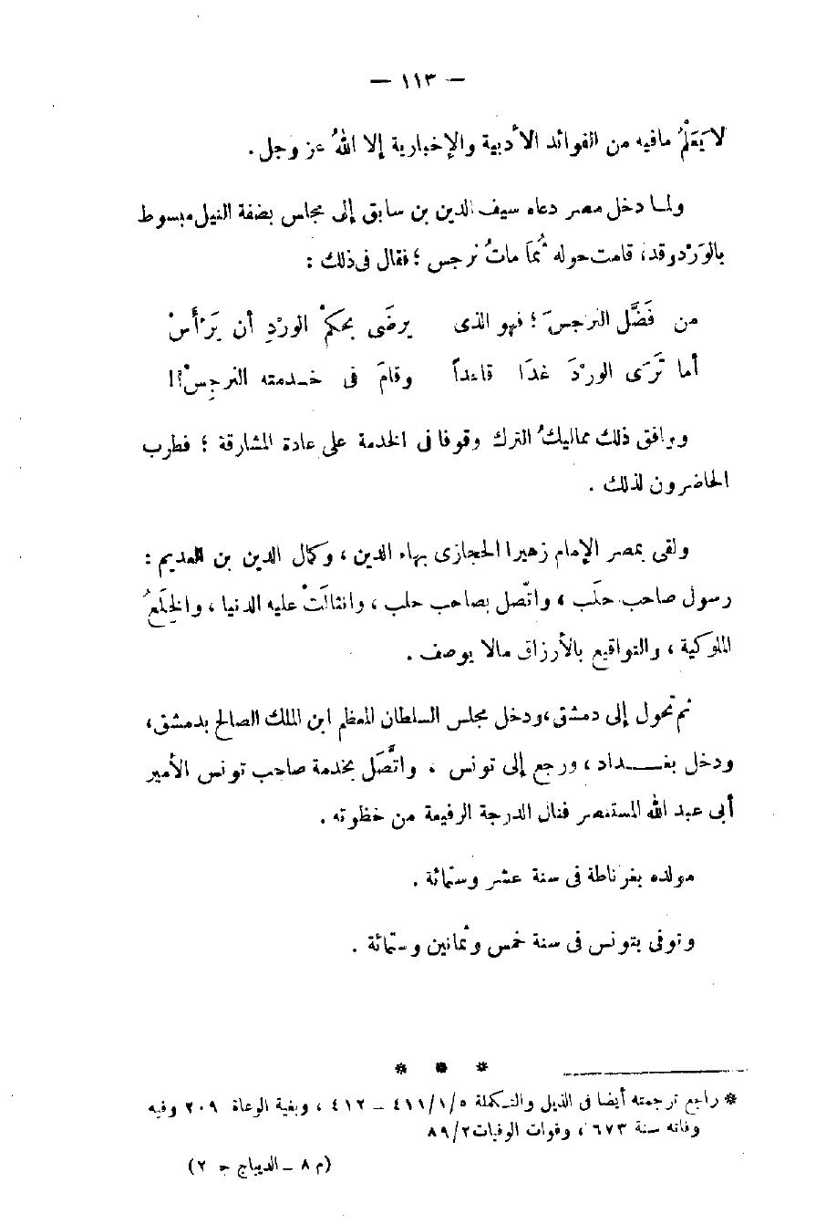 ووافق ذلك مماليك الترك وقوفاً في الخدمة على عادة المشارقة فطرب الحاضرون لذلك ولقي بمصر الإمام زهيراً الحجازي وكمال الدين بن العديم: رسول صاحب حلب واتصل بصاحب حلب وانثالت عليه الدنيا والخلع الملوكية والتواقيع بالأرزاق ما لا يوصف. ثم تحول إلى دمشق ودخل مجلس السلطان المعظم ابن الملك الصالح بدمشق ودخل بغداد ورجع إلى تونس. واتصل بخدمة صاحب تونس الأمير أبي عبد الله المستنصر فنال الدرجة الرفيعة من حظوته. مولده بغرناطة في سنة عشر وستمائة. وتوفي بتونس في سنة خمس وثمانين وستمائة.