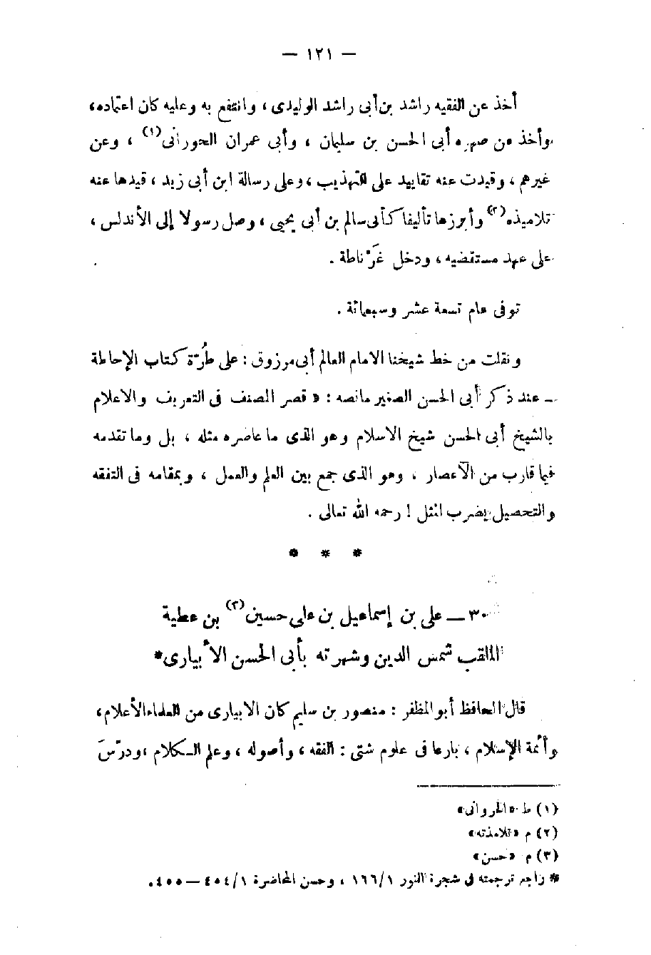 بن علي بن حسين بن عطية الملقب شمس الدين وشهرته بأبي الحسن الأبياري قال الحافظ أبو المظفر: منصور بن سليم كان الأبياري من العلماء الأعلام وأئمة الإسلام بارعاً في علوم شتى: الفقه وأصوله وعلم الكلام ودرس