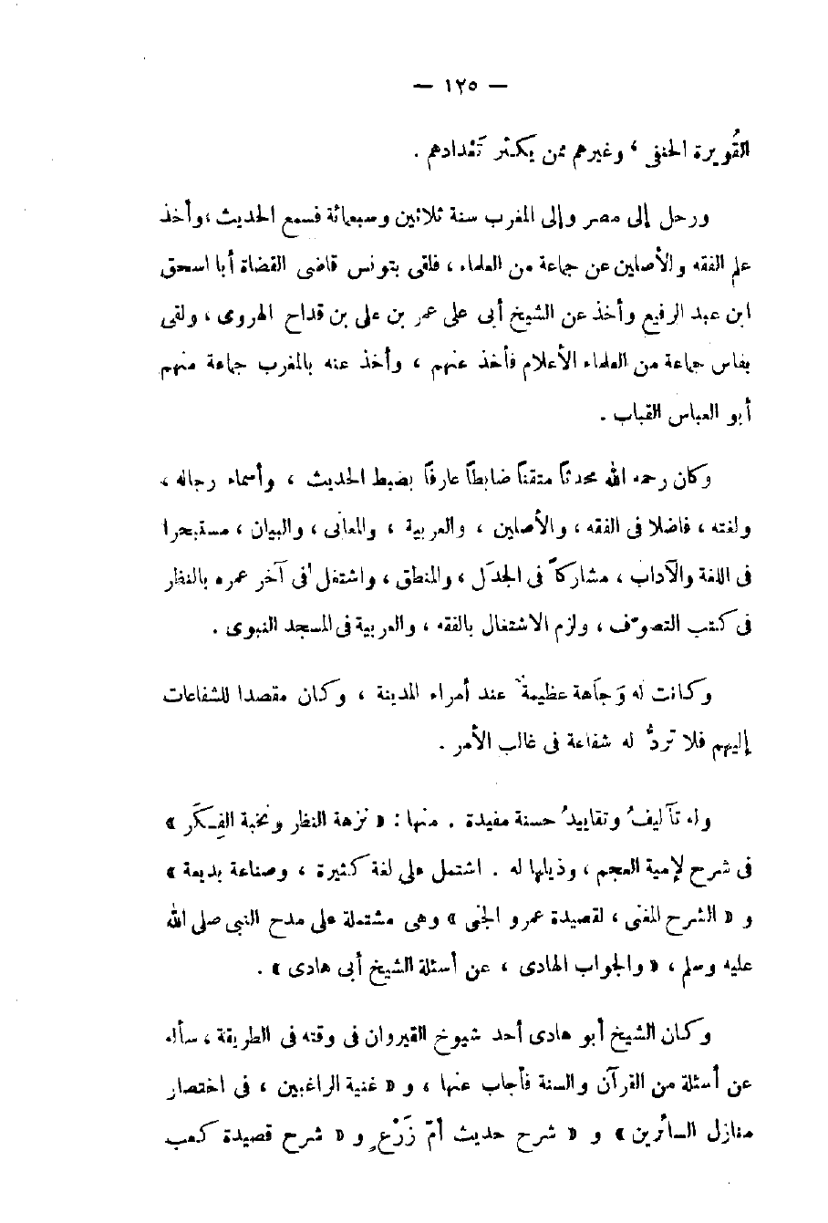 وكان الشيخ أبو هادي أحد شيوخ القيروان في وقته في الطريقة سأله عن أسئلة من القرآن والسنة فأجاب عنها وغنية الراغبين في اختصار منازل السائرين وشرح حديث أم زرع وشرح قصيدة كعب