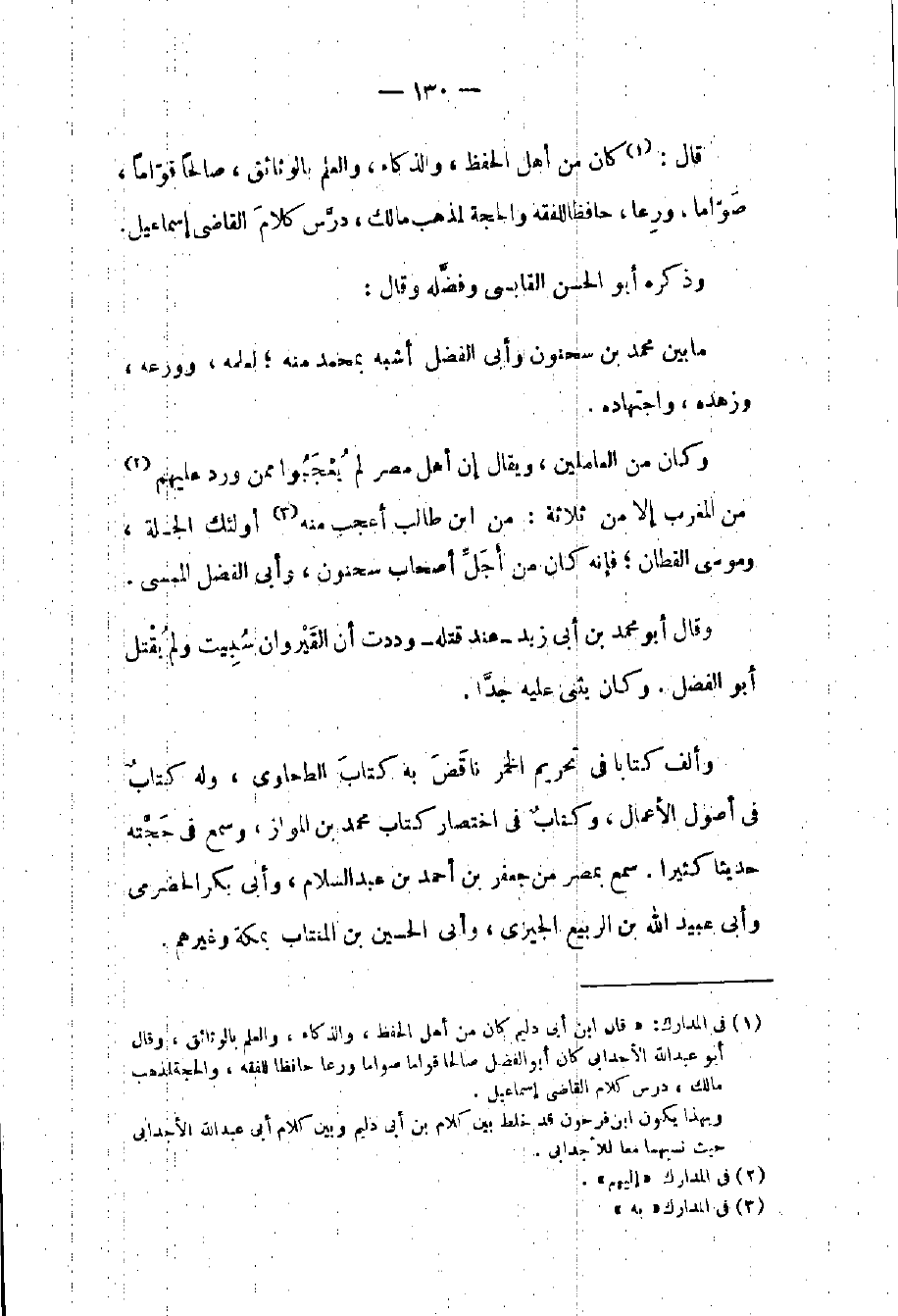 قال: كان من أهل الحفظ والذكاء والعلم بالوثائق صالحاً قواماً صواماً ورعاً حافظاً للفقه والحجة لمذهب مالك درس كلام القاضي إسماعيل.