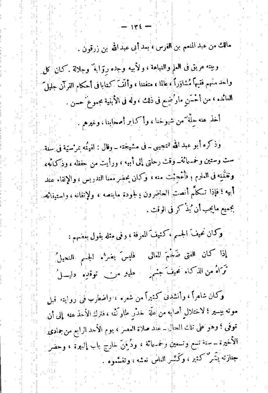 مالك من عبد المنعم بن الفرس بعد أبي عبد الله بن زرقون. وبيته عريق في العلم والنباهة ولأبيه وجده رواية وجلالة. كان كل واحد منهم فقيهاً مشاوراً عالماً متفنناً وألف كتاباً في أحكام القرآن جليل الفائدة من أحسن ما وضع في ذلك وله في الأبنية مجموع حسن. حدث عنه جلة من شيوخنا وأكابر أصحابنا وغيرهم.