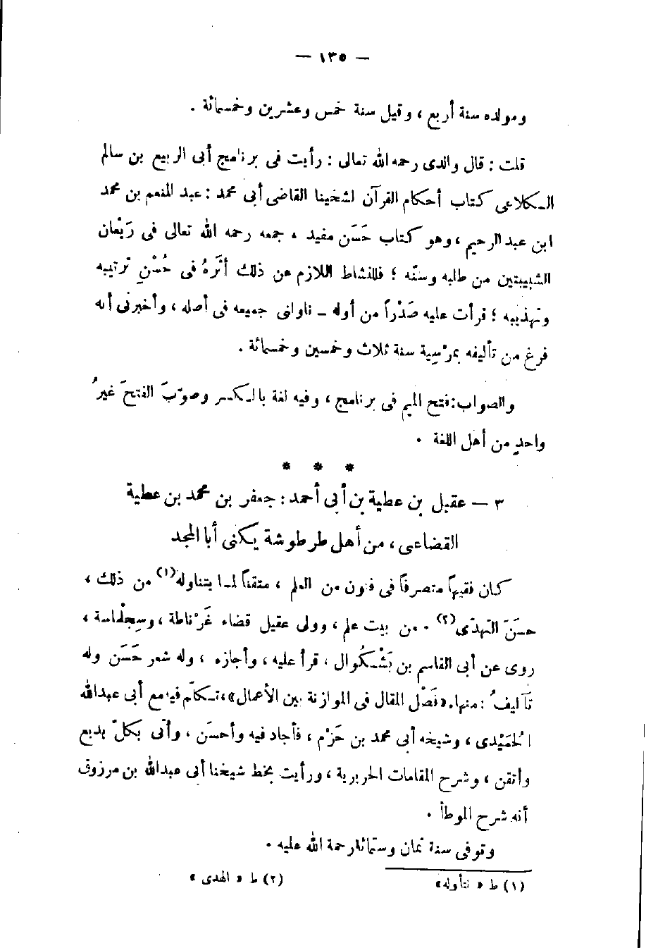 ومولده سنة أربع وقيل سنة خمس وعشرين وخمسمائة قلت: قال والدي رحمه الله تعالى: رأيت في برنامج أبي الربيع بن سالم الكلاعي كتاب أحكام القرآن لشيخنا القاضي أبي محمد: عبد المنعم بن محمد بن عبد الرحيم وهو كتاب حسن مفيد جمعه رحمه الله تعالى في ريعان الشبيبتين من طلبه وسنه فللنشاط اللازم عن ذلك أثره في حسن ترتيبه وتهذيبه قرأت عليه صدراً من أوله - ناولني جميعه في أصله وأخبرني أنه فرغ من تأليفه بمرسية سنة ثلاث وخمسين وخمسمائة. والصواب: فتح الميم في برنامج وفيه لغة بالكسر وصوب الفتح غير واحد من أهل اللغة.