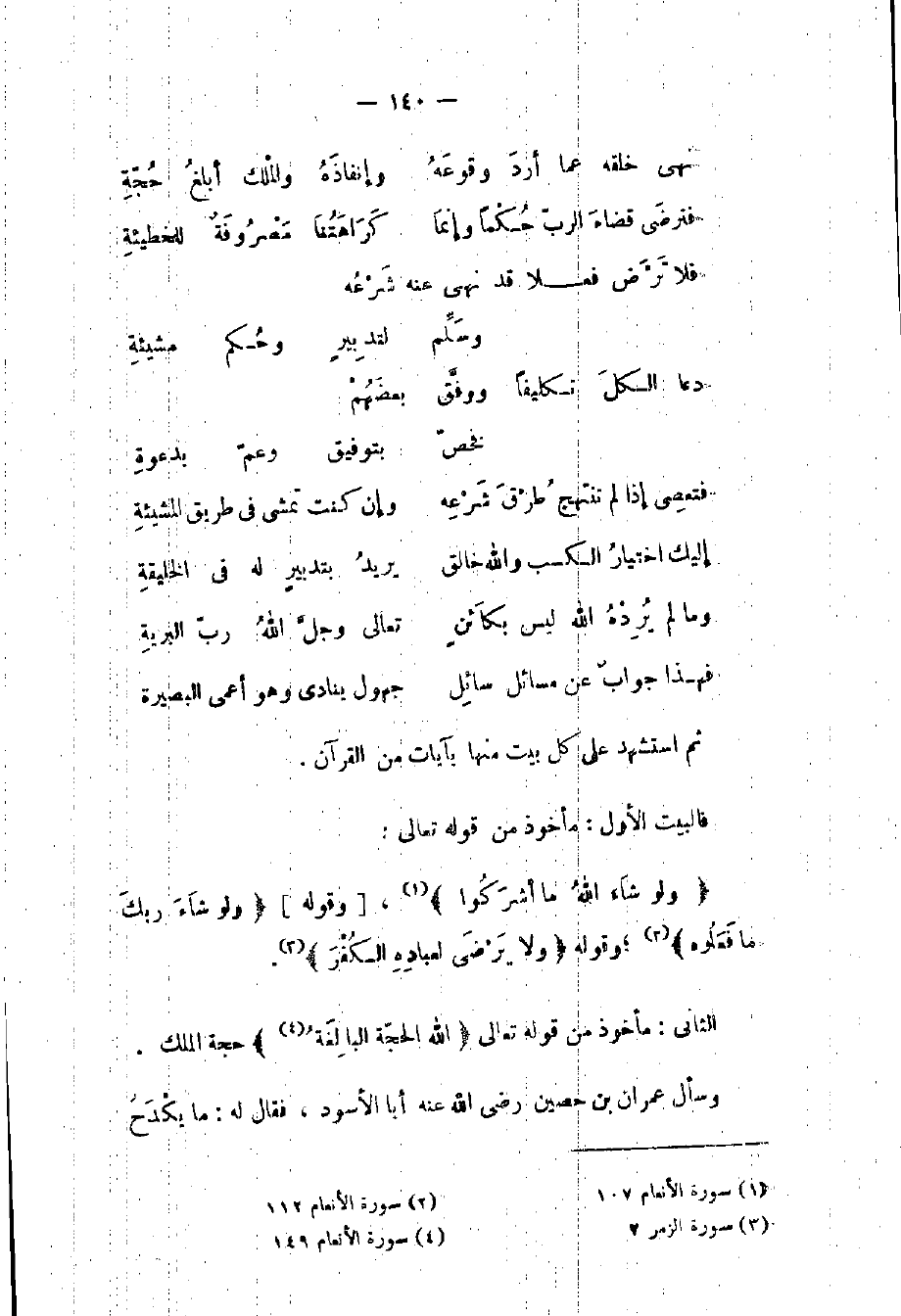 فالبيت الأول: مأخوذ من قوله تعالى: " لو شاء الله ما أشركوا " الأنعام: 107 وقوله: " ولو شاء ربك ما فعلوه " الأنعام 112 وقوله: " ولا يرضى لعباده الكفر " الزمر 7.