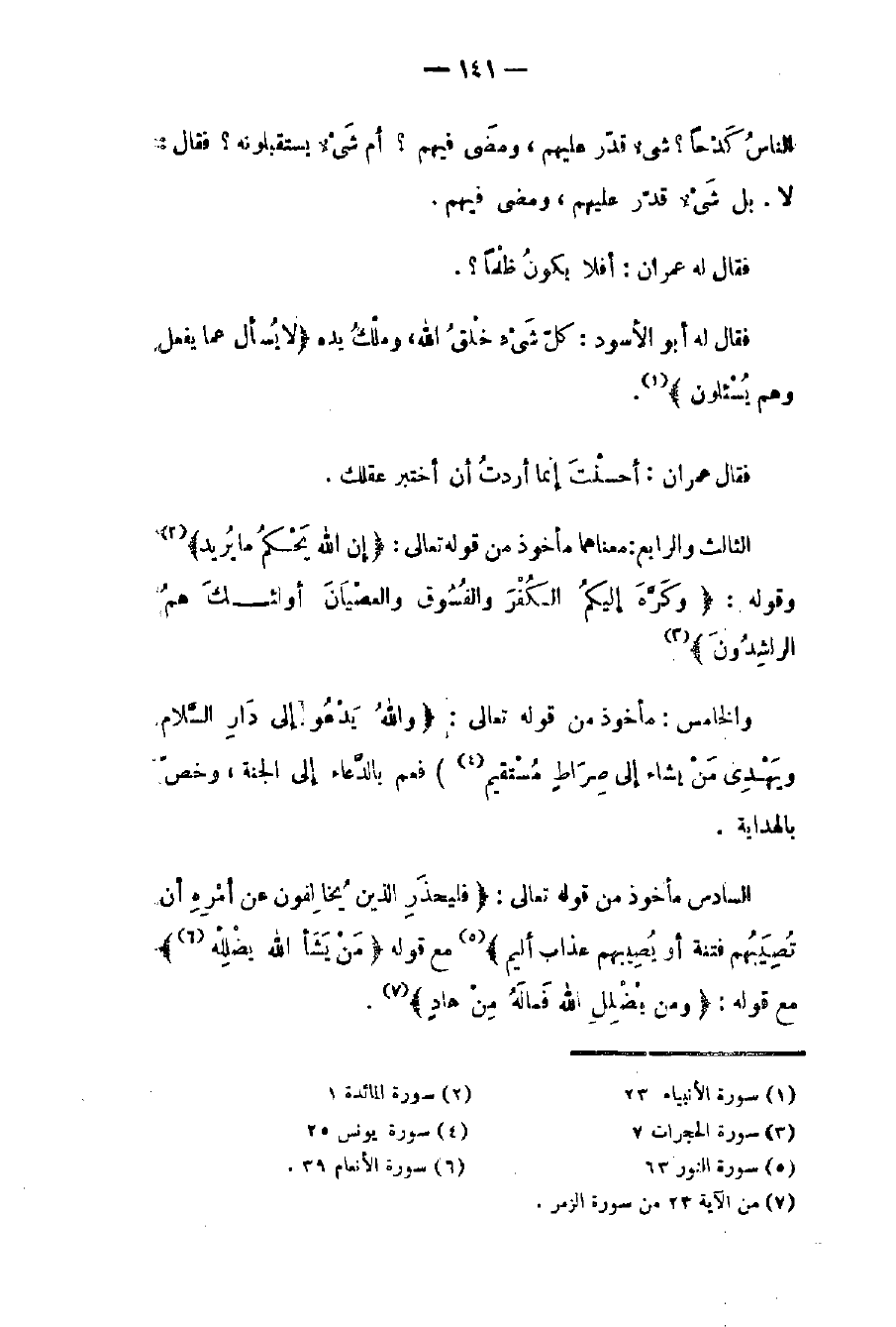 الناس كدحاً؟ شيء قدر عليهم ومضى فيهم؟ أم شيء يستقبلونه؟ فقال: لا بل شيء قدر عليهم ومضى فيهم. فقال له عمران: أفلا يكون ظلماً؟ فقال له أبو الأسود: كل شيء خلق الله وملك يده " لا يسأل عما يفعل وهم يسئلون " الأنبياء 23 فقال عمران: أحسنت إنما أردت أن أختبر عقلك.