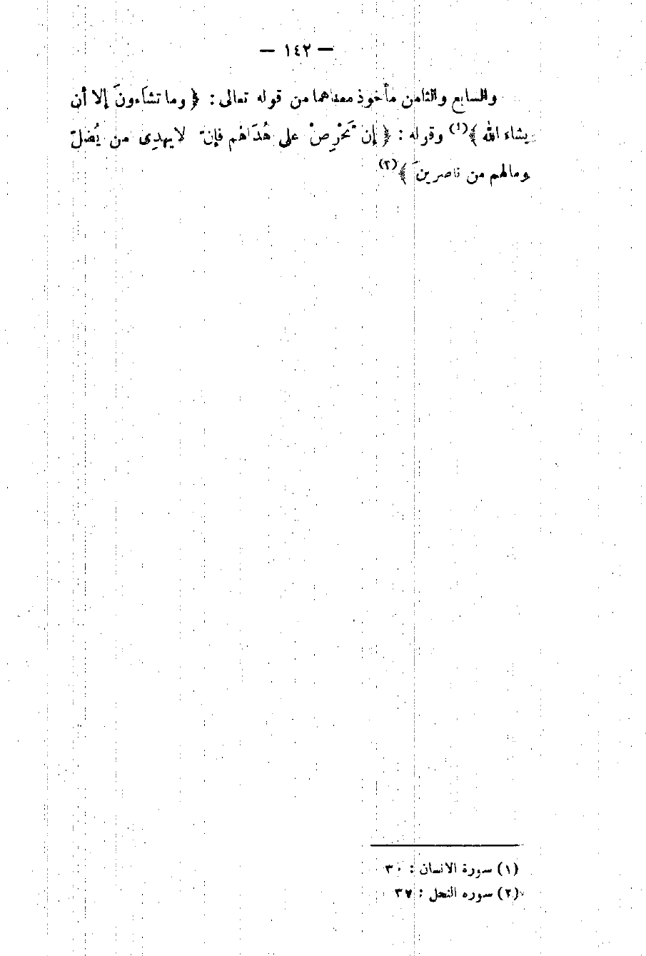 والسابع والثامن: مأخوذ معناهما من قوله تعالى: " وما تشاؤون إلا أن يشاء الله " الإنسان:30 وقوله: " إن تحرص على هداهم فإن الله لا يهدي من يضل وما لهم من ناصرين " النحل: 37.