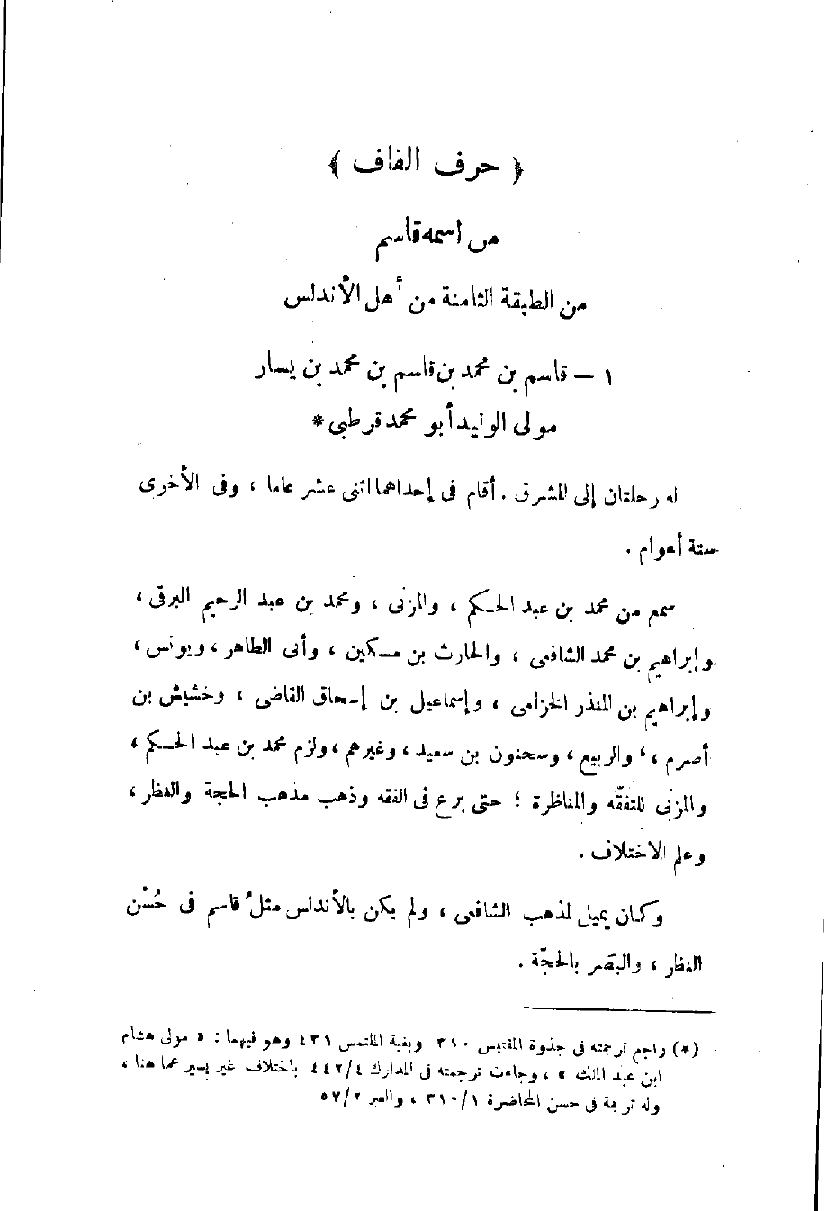 قرطبي له رحلتان إلى المشرق أقام في إحداهما اثني عشر عاماً وفي الأخرى ستة أعوام سمع من محمد بن عبد الحكم والمزني ومحمد بن عبد الرحيم البرقي وإبراهيم بن محمد الشافعي والحارث بن مسكين وأبي الطاهر ويونس وإبراهيم بن المنذر الخزامي وإسماعيل بن إسحاق القاضي وخشيش بن أصرم والربيع وسحنون بن سعيد وغيرهم ولزم محمد بن عبد الحكم والمزني للتفقه والمناظرة حتى برع في الفقه وذهب مذهب الحجة والنظر وعلم الاختلاف. وكان يميل لمذهب الشافعي ولم يكن بالأندلس مثل قاسم في حسن النظر والبصر بالحجة