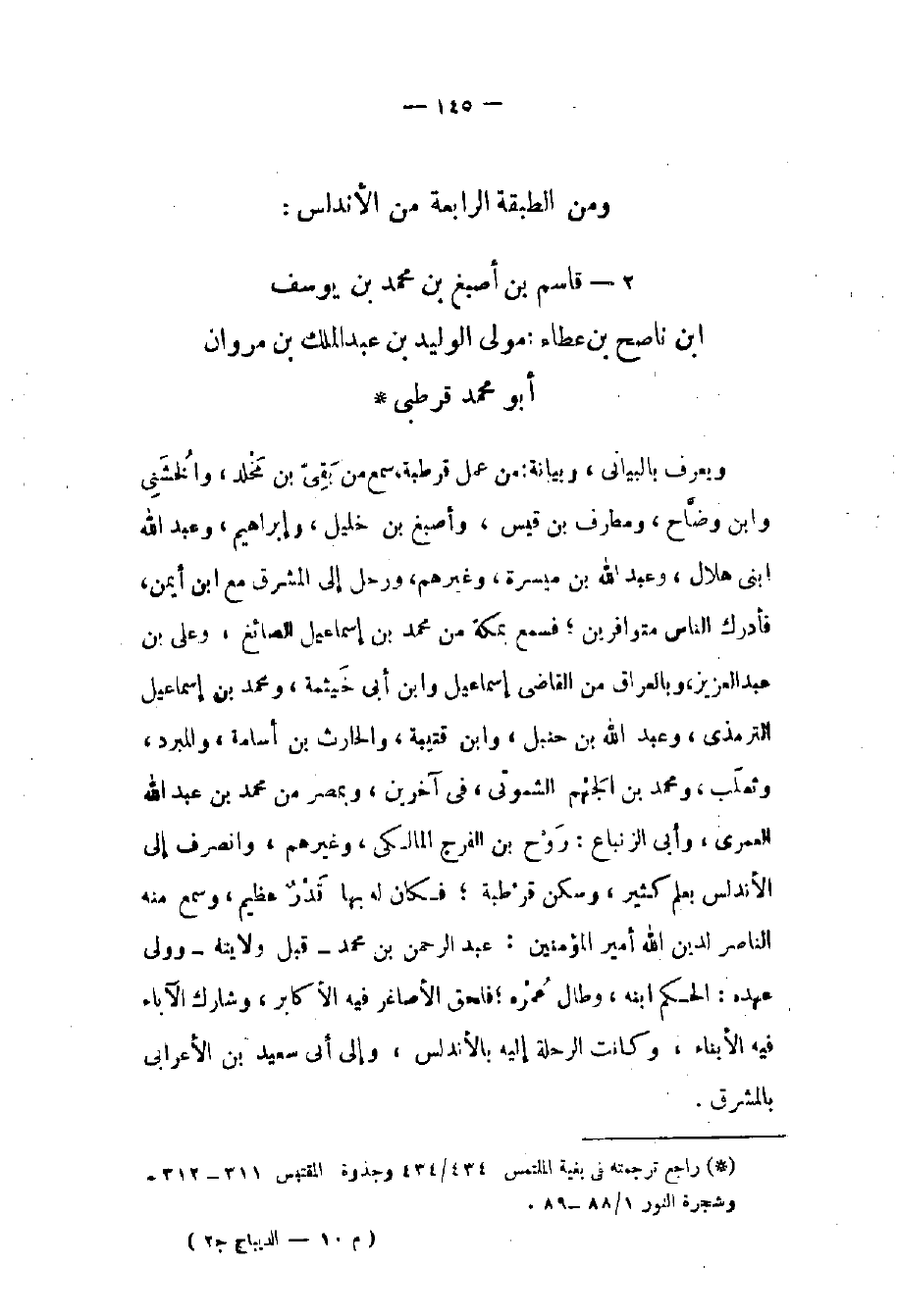 قرطبي ويعرف بالبياني وبيانة: من عمل قرطبة سمع من بقي بن مخلد والخشني وابن وضاح ومطرف بن قيس وأصبغ بن خليل وإبراهيم وعبد الله ابني هلال وعبد الله بن ميسرة وغيرهم ورحل إلى المشرق مع بن أيمن فأدرك الناس متوافرين فسمع بمكة من محمد بن إسماعيل الصائغ وعلي بن عبد العزيز وبالعراق من القاضي إسماعيل وابن أبي خيثمة ومحمد بن إسماعيل الترمذي وعبد الله بن حنبل وابن قتيبة والحارث بن أسامة والمبرد وثعلب ومحمد بن الجهم الشموتي في آخرين وبمصر من محمد بن عبد الله العمري وأبي الزنباع: روح بن الفرج المالكي وغيرهم وانصرف إلى الأندلس بعلم كثير وسكن قرطبة فكان له بها قدر عظيم وسمع منه الناصر لدين الله أمير المؤمنين: عبد الرحمن بن محمد - قبل ولايته - وولي عهده: الحكم ابنه وطال عمره فلحق الأصاغر فيه الأكابر وشارك الآباء فيه الأبناء وكانت الرحلة إليه بالأندلس وإلى أبي سعيد بن الأعرابي بالمشرق.