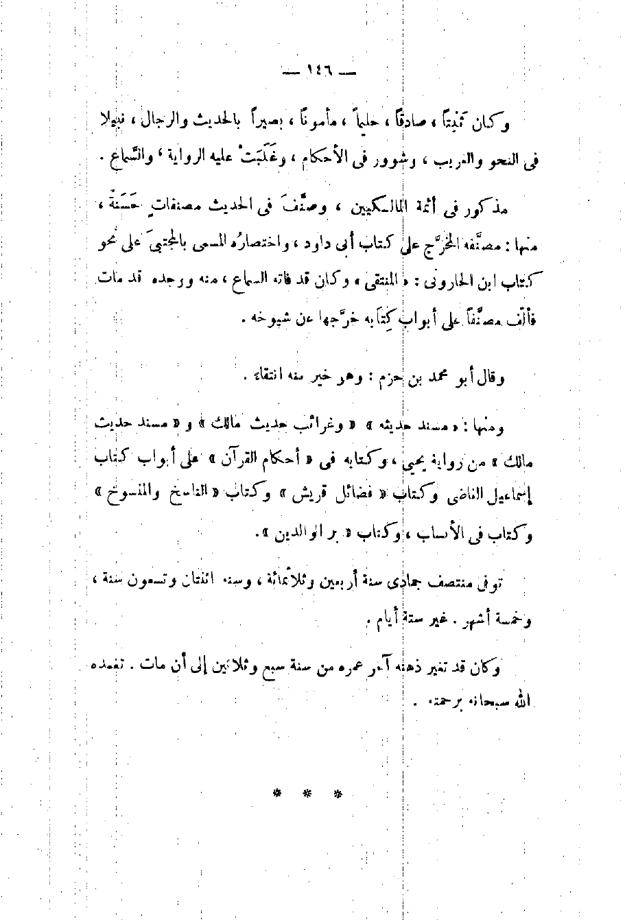 مذكور في أئمة المالكيين وصنف في الحديث مصنفات حسنة منها: مصنفه المخرج على كتاب أبي داود واختصاره المسمى بالمجتبى على نحو كتاب بن الحاروني: المنتقى وكان قد فاته السماع منه ووجده قد مات فألف مصنفاً على أبواب كتابه خرجها عن شيوخه. وقال أبو محمد بن حزم: وهو خير انتفاء.